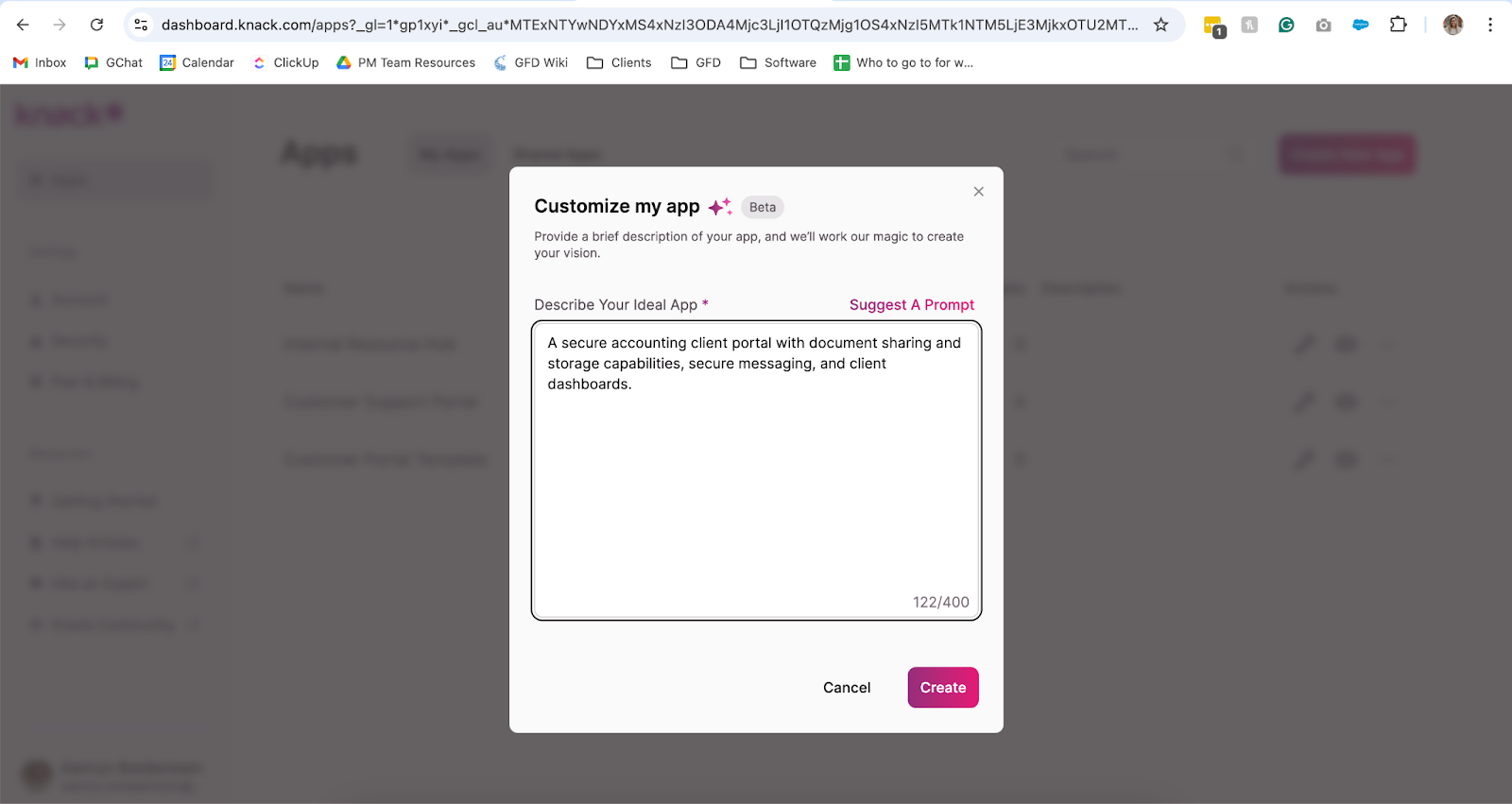 - In the pop-up, describe the solution you’re making. For example: “A secure accounting client portal with document sharing and storage capabilities, secure messaging, and client dashboards.” The AI will suggest an initial structure.