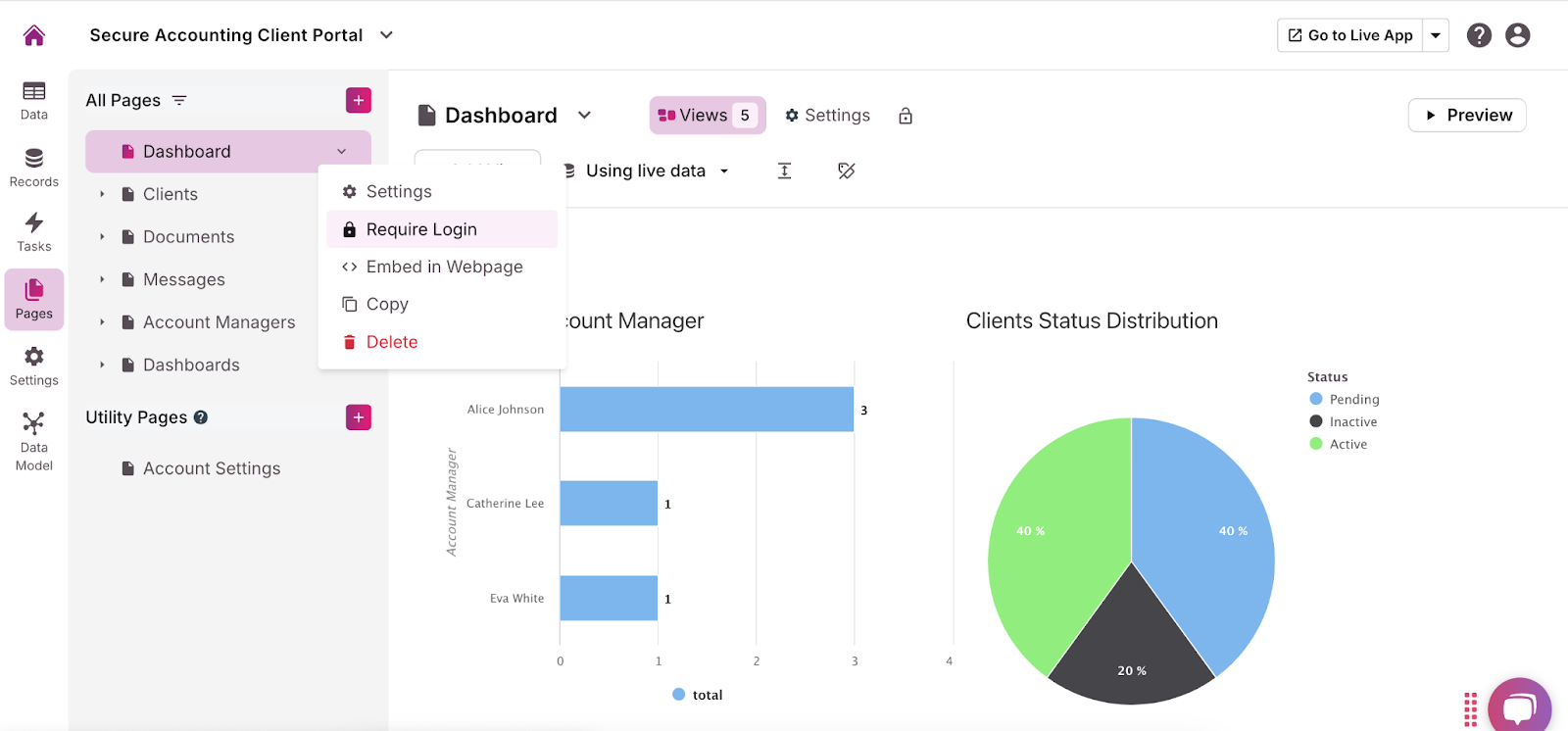 - Explore the template components and edit them to meet your requirements. Using the menu on the left, you can adjust, add, or remove tables, fields, connections, pages, and views. Make sure you have a table for client data (name, email address, phone number, etc.). We recommend adding a form view so clients can upload documents to the portal.