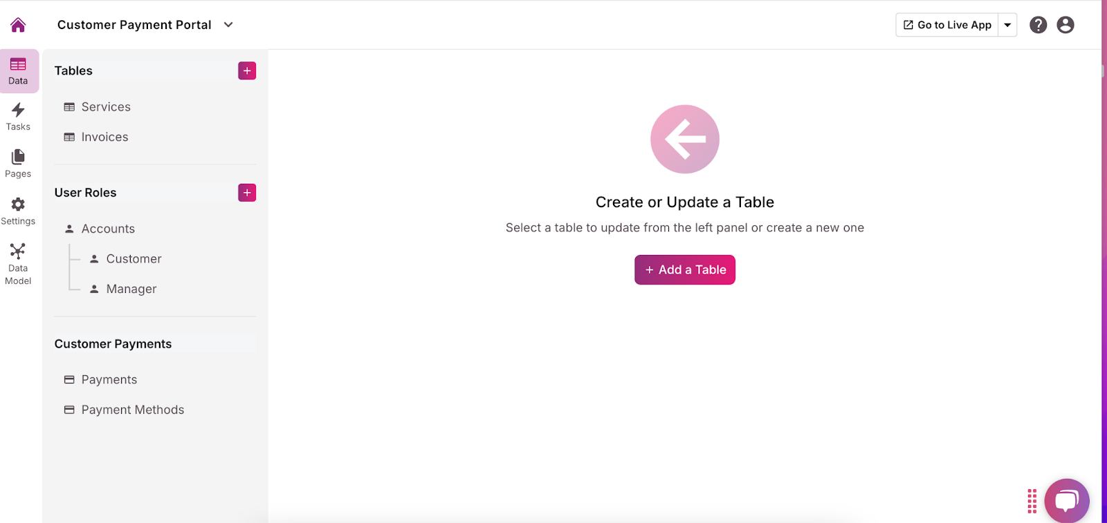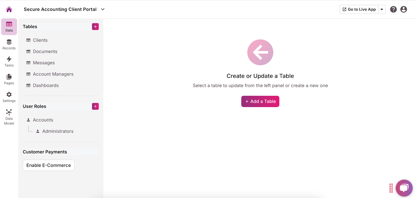 - Explore the suggested structure and edit it to fit your needs. Using the menu to the left, you can add, adjust, or remove tables, fields, connections, pages, and views. Make sure you have a table for client data (name, email address, phone number, etc.). We recommend adding a form view so clients can upload documents to the portal.