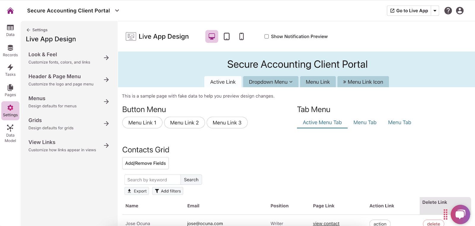 - In the menu on the left side of the builder, click “Settings” and then “Live App Design” to customize the user interface. You can add your company logo, change fonts, select colors, and more to make the portal fit your brand.