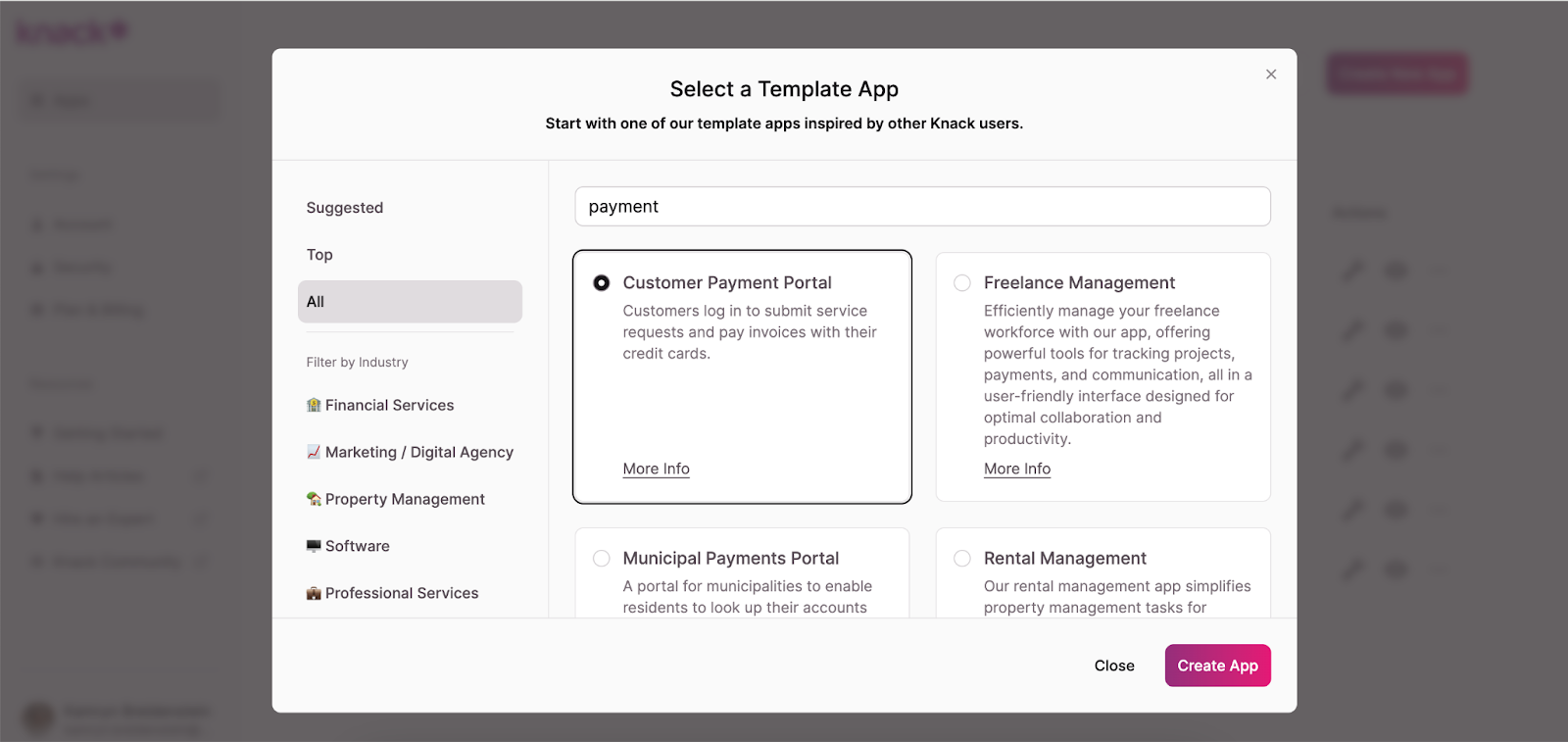 Knack also offers a library of free templates for building custom web apps. These templates are easy to use and offer a great starting point. For this project, we recommend the Customer Payment Portal Template. Follow these steps: