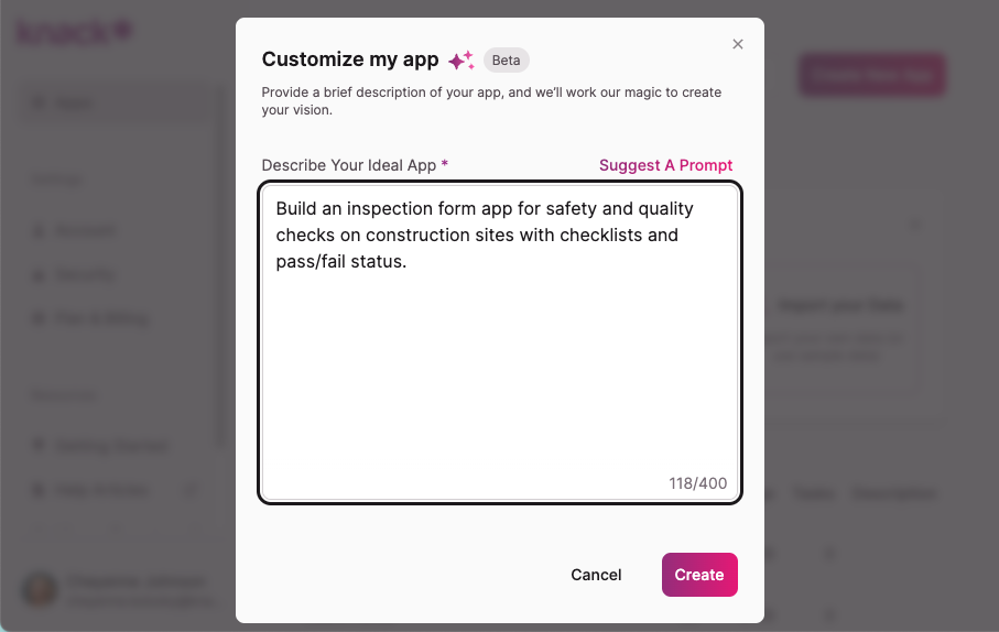 Method 1: Building a Construction Form with Knack’s AI App Builder