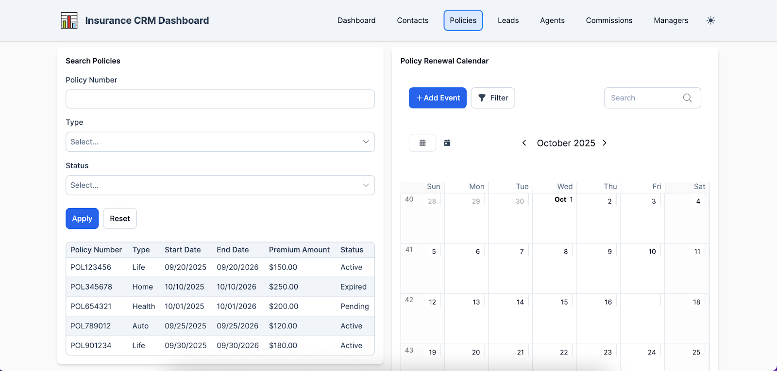 • Policy Lifecycle Tracking: Enables agents to manage every stage of a policy’s journey in one place, ensuring nothing falls through the cracks from initial quote to claim resolution.