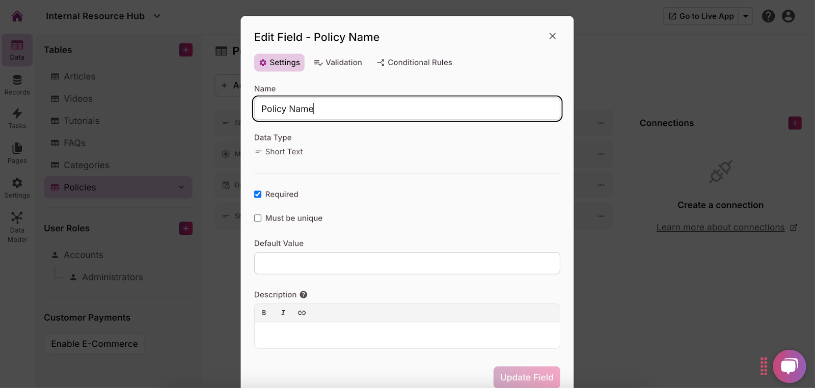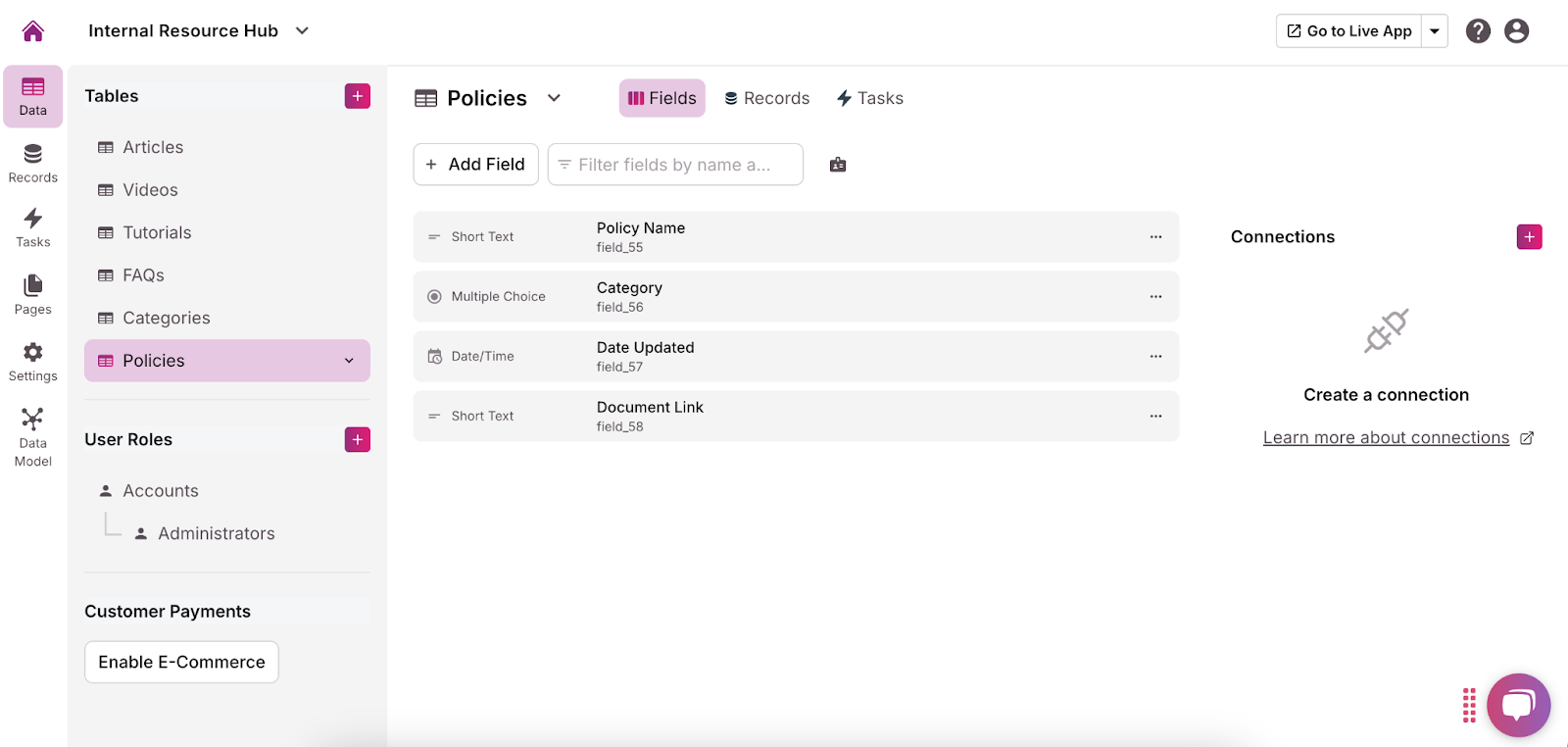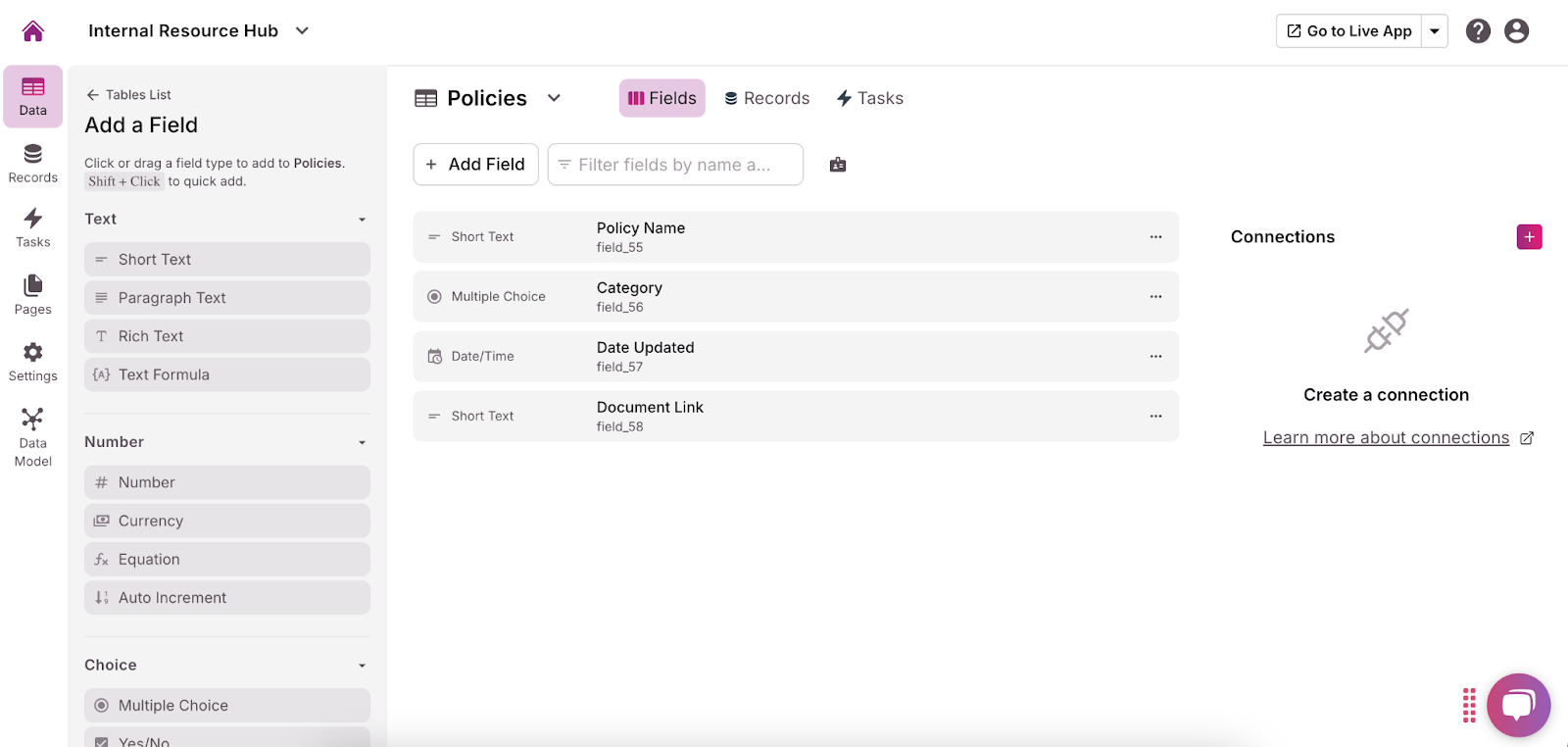 For example, if you’re creating a table to manage company policies, the table might be called “Policies,” and the fields could include “Policy Name,” “Category,” “Date Updated,” and “Document Link.”