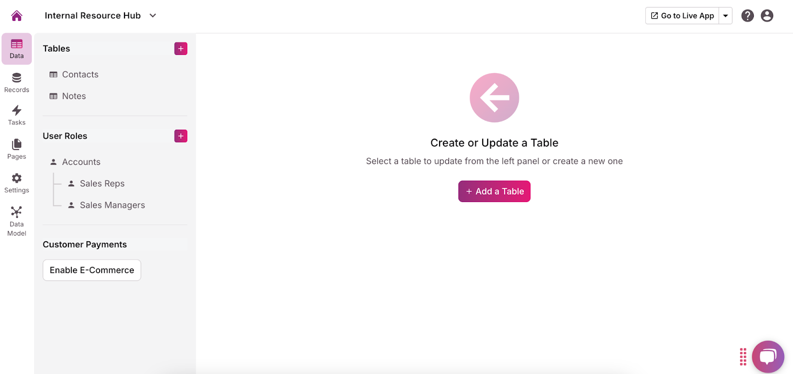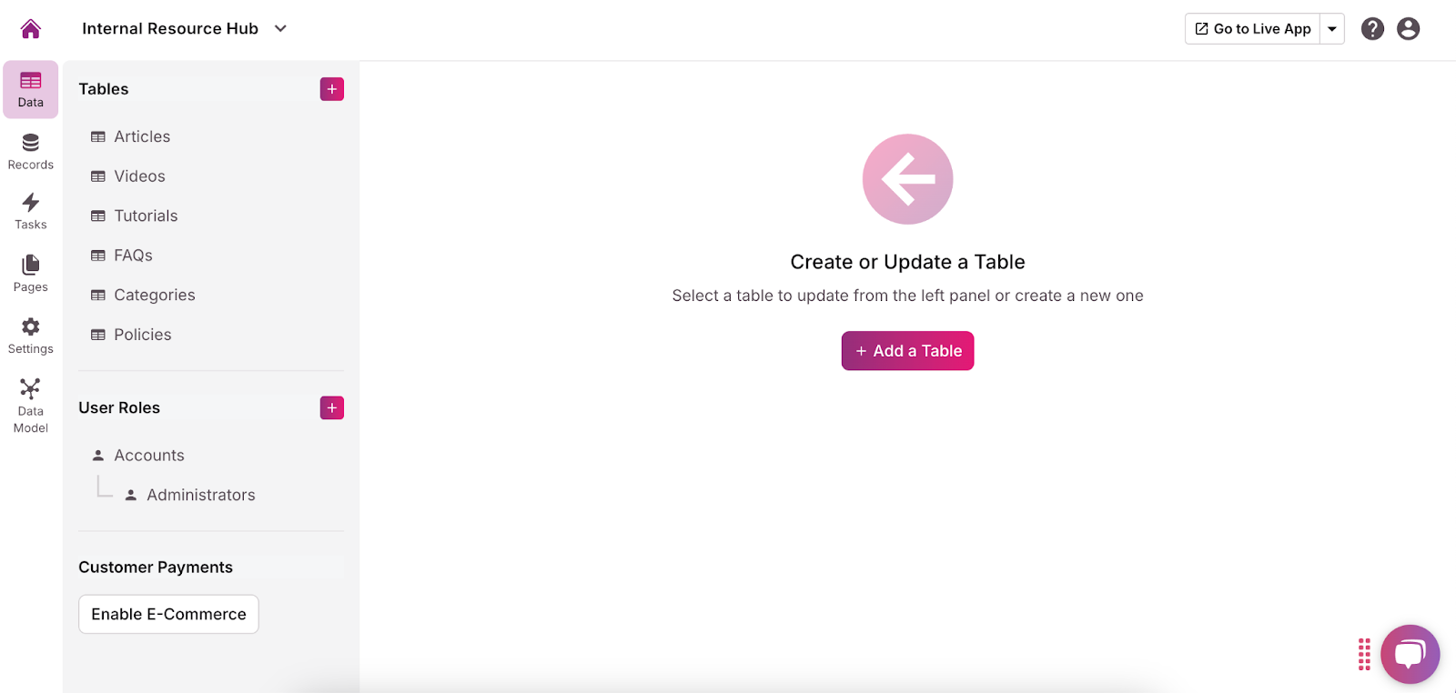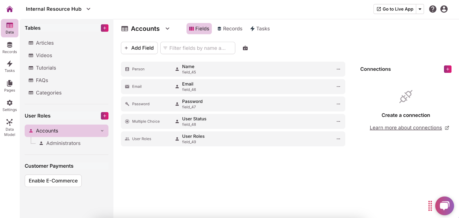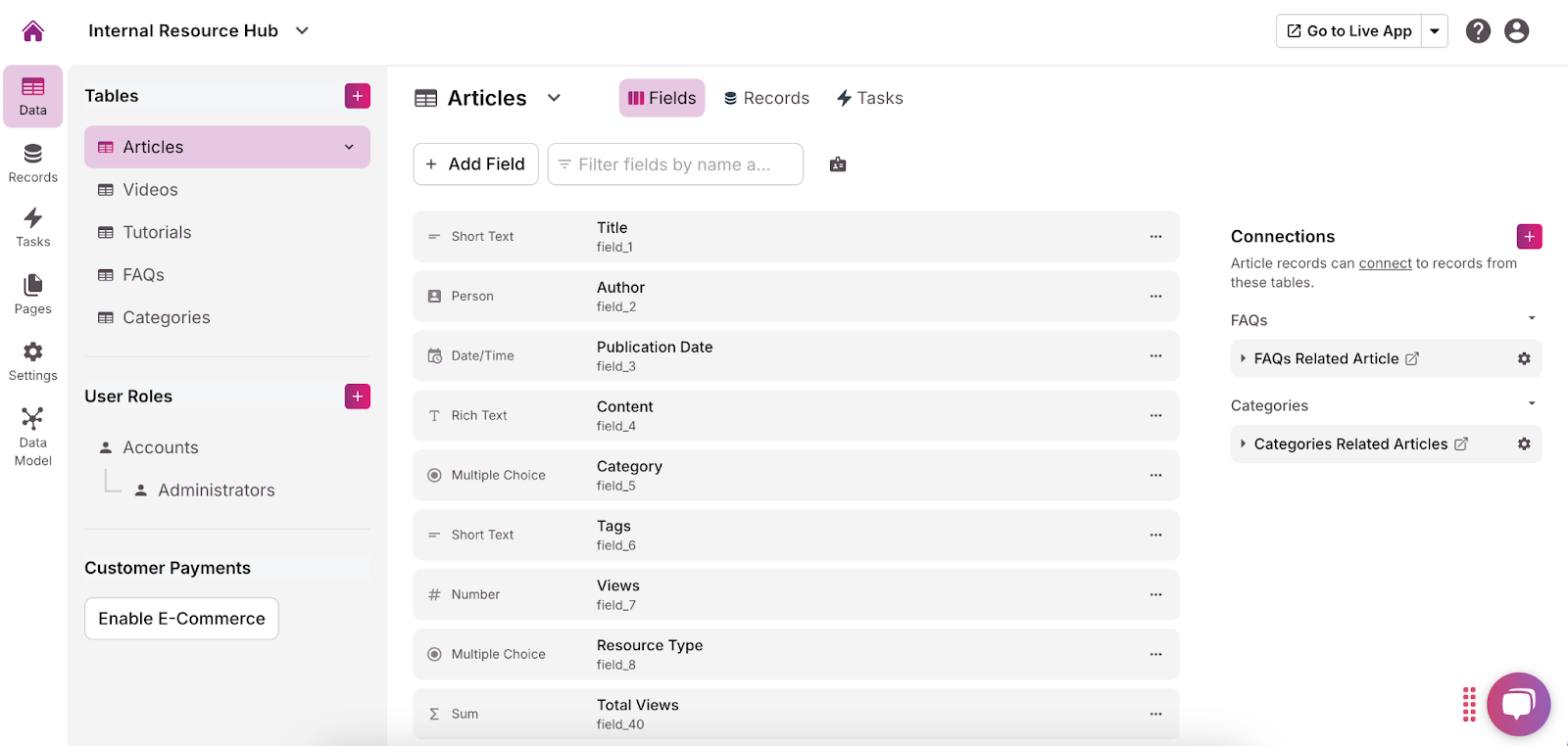 In Knack, tables and fields are the backbone of your internal resource hub. Tables, known as “objects” in Knack, are used to store different types of data, while fields are the individual pieces of information within those tables. These tables and fields help you organize and categorize your data in a structured way, making it easier for users to find and use the information they need.