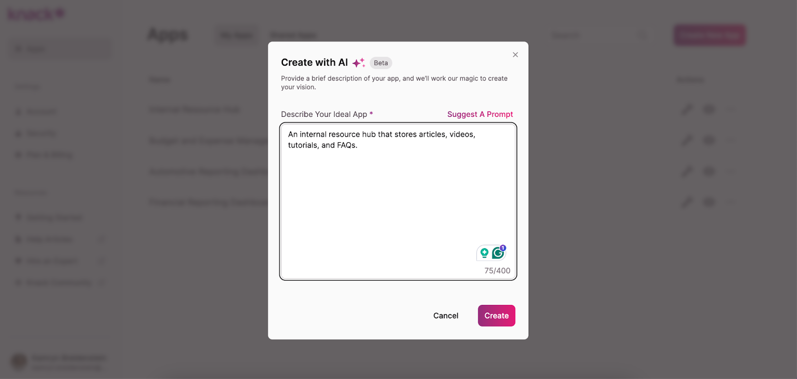- In the pop-up, describe the app you’re building and the features it should include. For example: “An internal resource hub that stores articles, videos, tutorials, and FAQs.” The AI will then propose an initial structure.