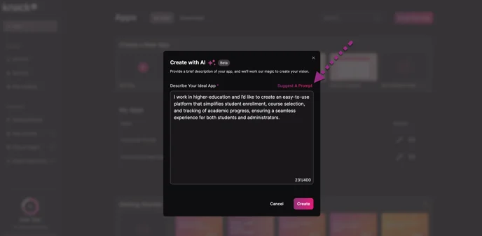 • If needed, you can use the “Suggest A Prompt” option for inspiration. If you’re still having issues creating a prompt, we recommend leveraging ChatGPT to craft the perfect prompt.