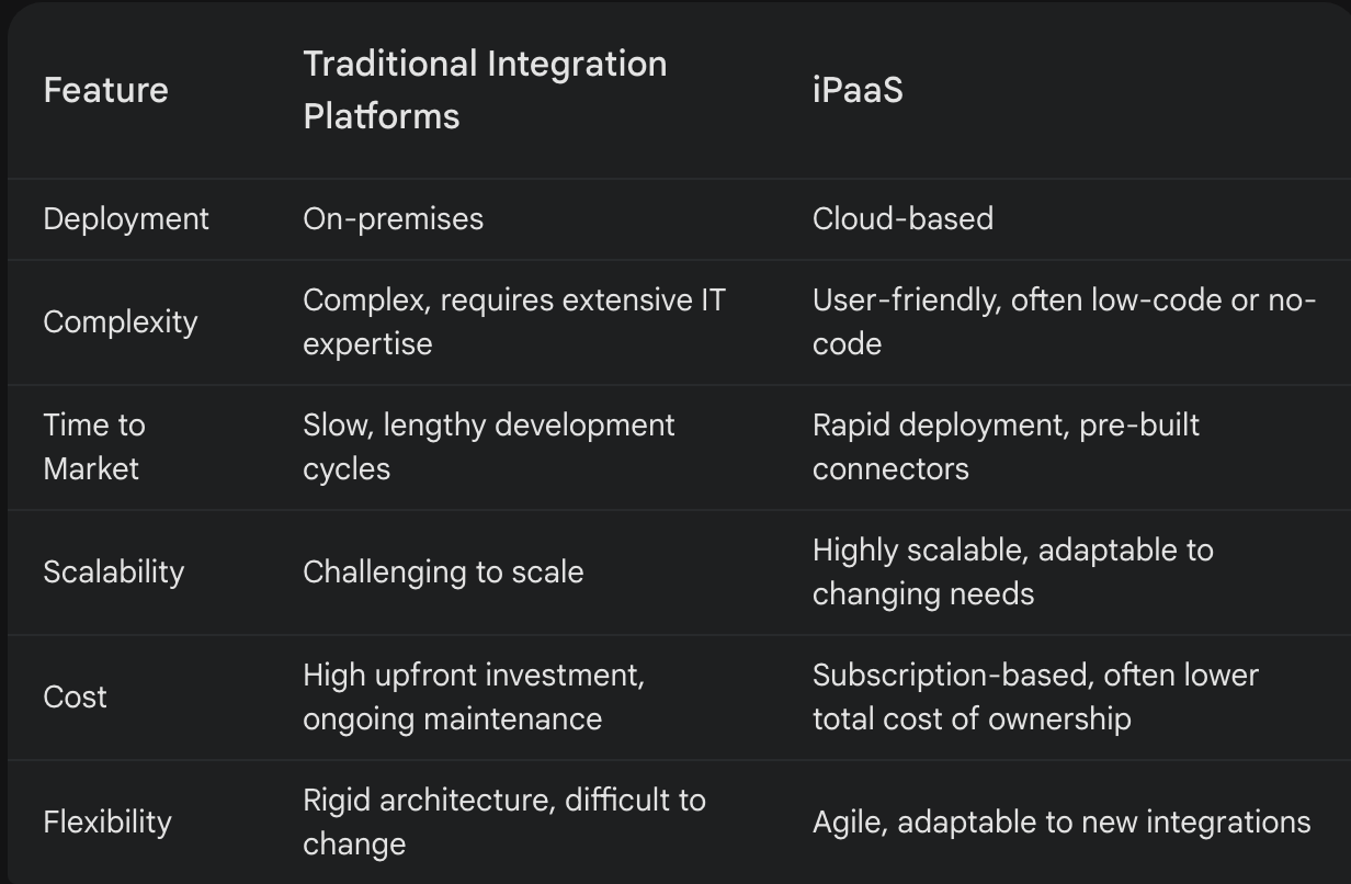 Traditional integration platforms and modern iPaaS offerings represent distinct approaches to connecting software systems. Let’s break down the key differences: