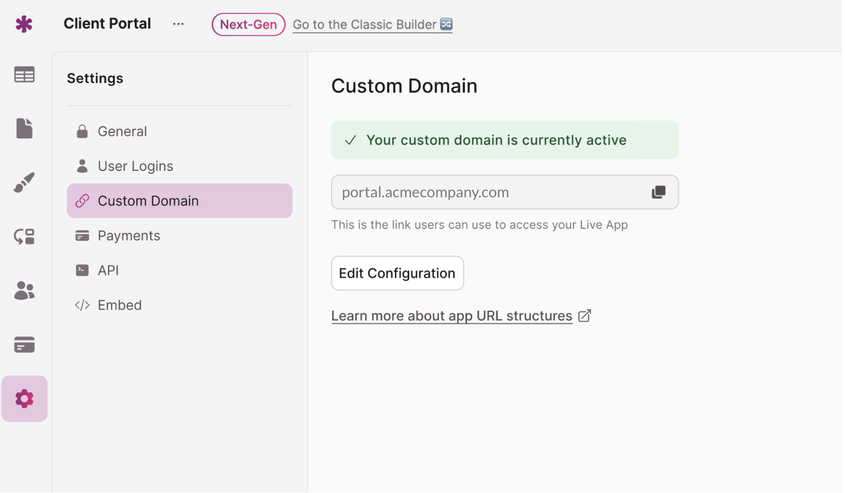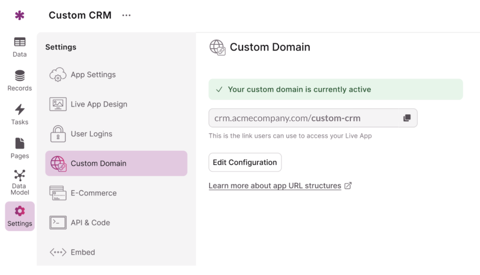 With Knack, connecting a custom domain is straightforward. While your app is typically accessible at a unique Knack URL like apps.knack.com/acmecompany/client-portal, using a custom domain, such as portal.acmecompany.com, offers a fully white-labeled experience that reinforces your brand and builds trust with your users.
