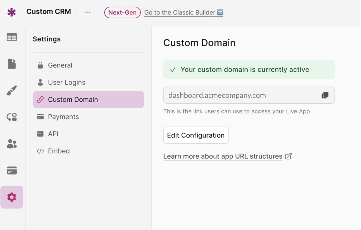Note: that if you used the crm.acmecompany.com as the custom domain for your Classic version of the Live App, then you cannot use it again for the Next Gen version of your Live App (so we used dashboard.acmecompany.com as the Next Gen version’s custom domain in this example)