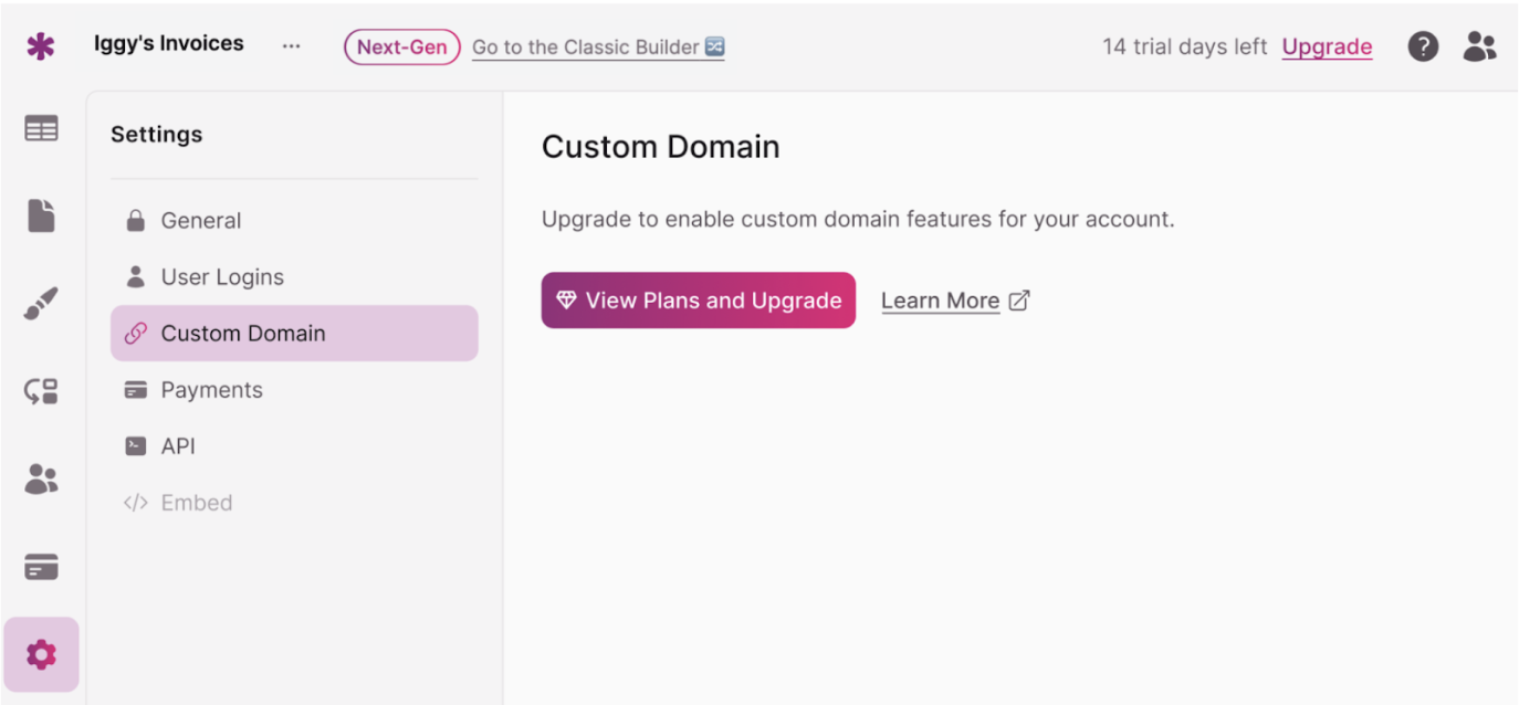 Note: Starter and Trial users must upgrade to Pro to access custom domains.