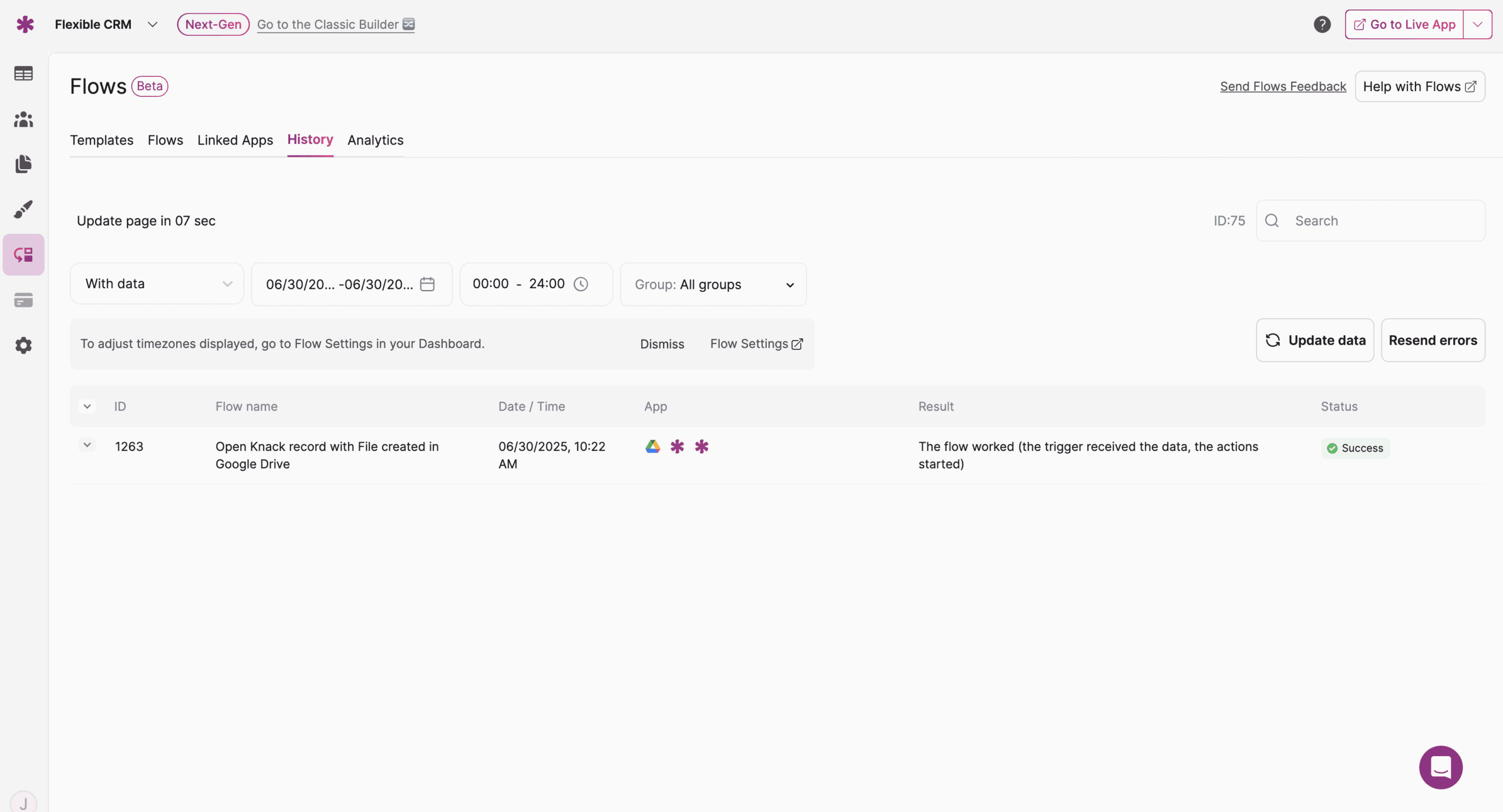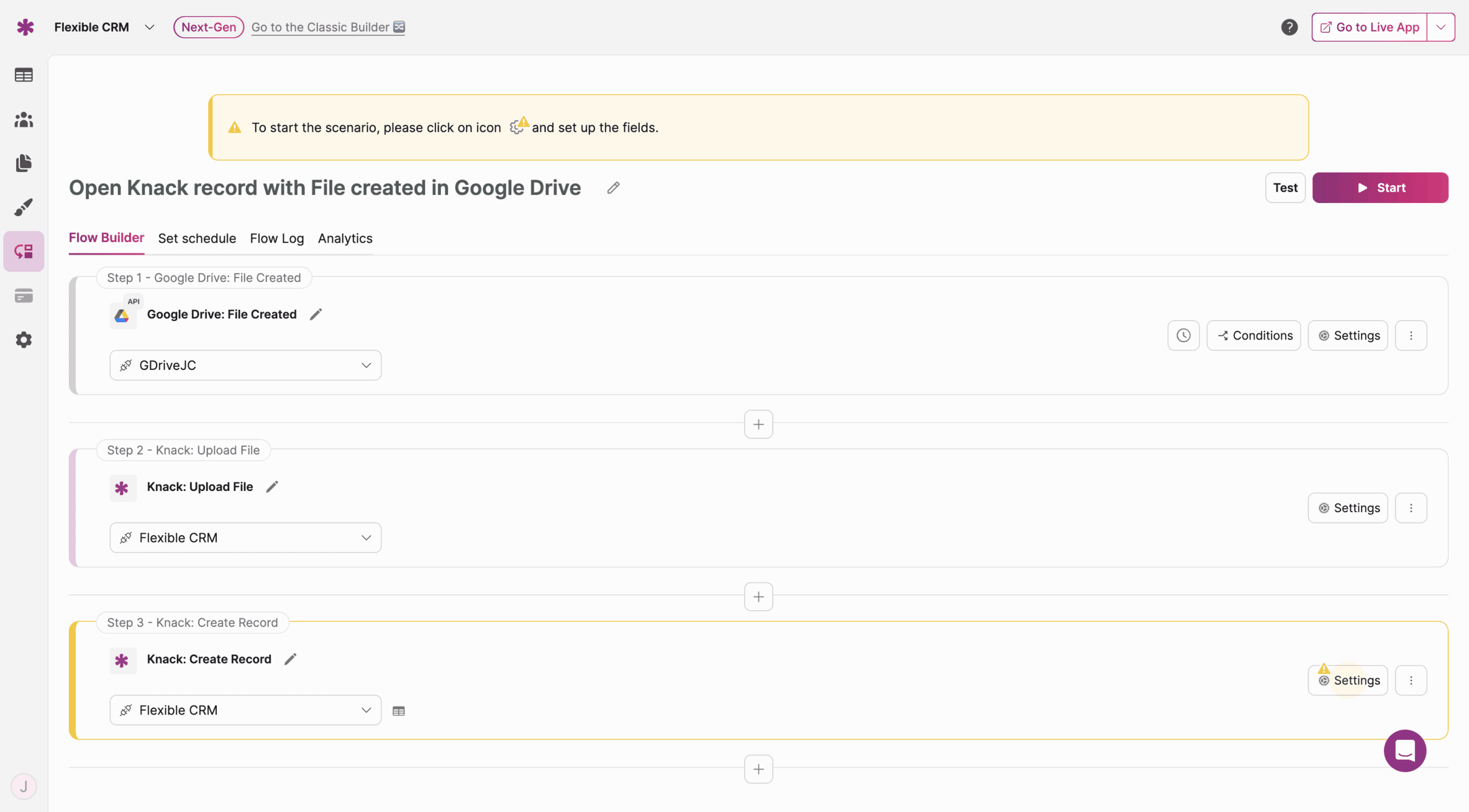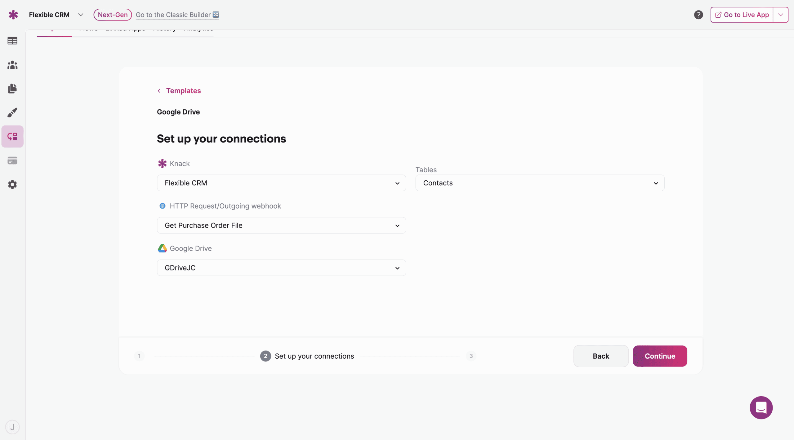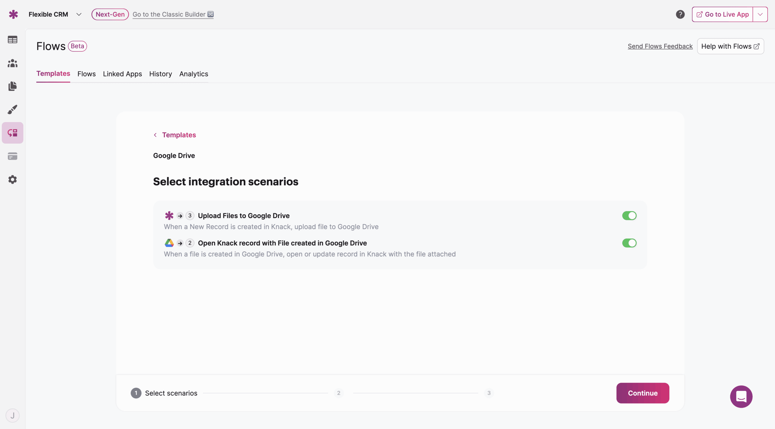 Knack Flows Templates are pre-built workflows that automate tasks between Knack and your favorite tools, like Google Drive, Google Sheets, and even other Knack apps. Each template includes one or more “scenarios” which are plug-and-play automation flows.