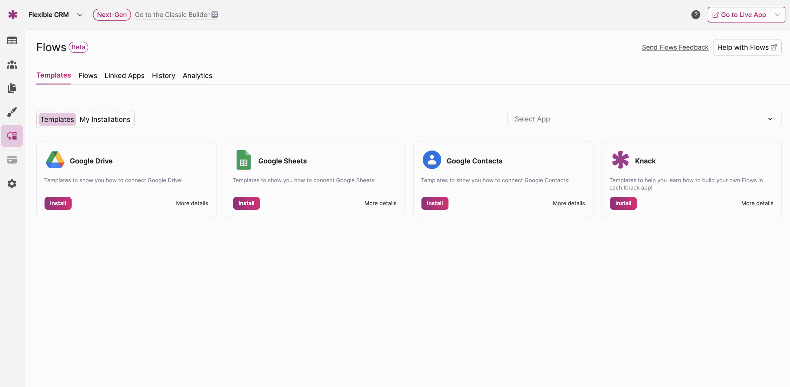Head to your Knack Builder and click Flows in the left-hand navigation. Then select the Templates tab at the top.