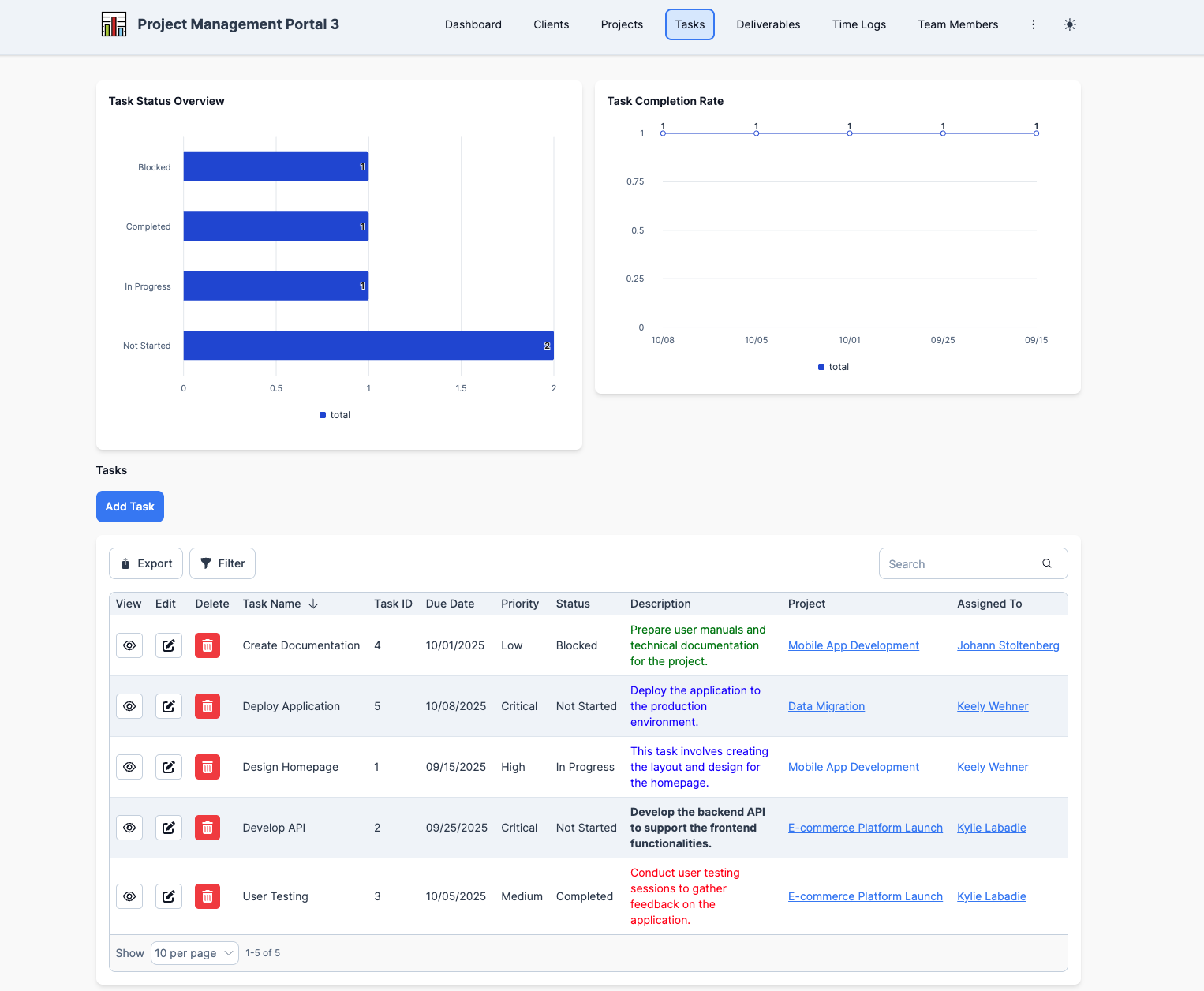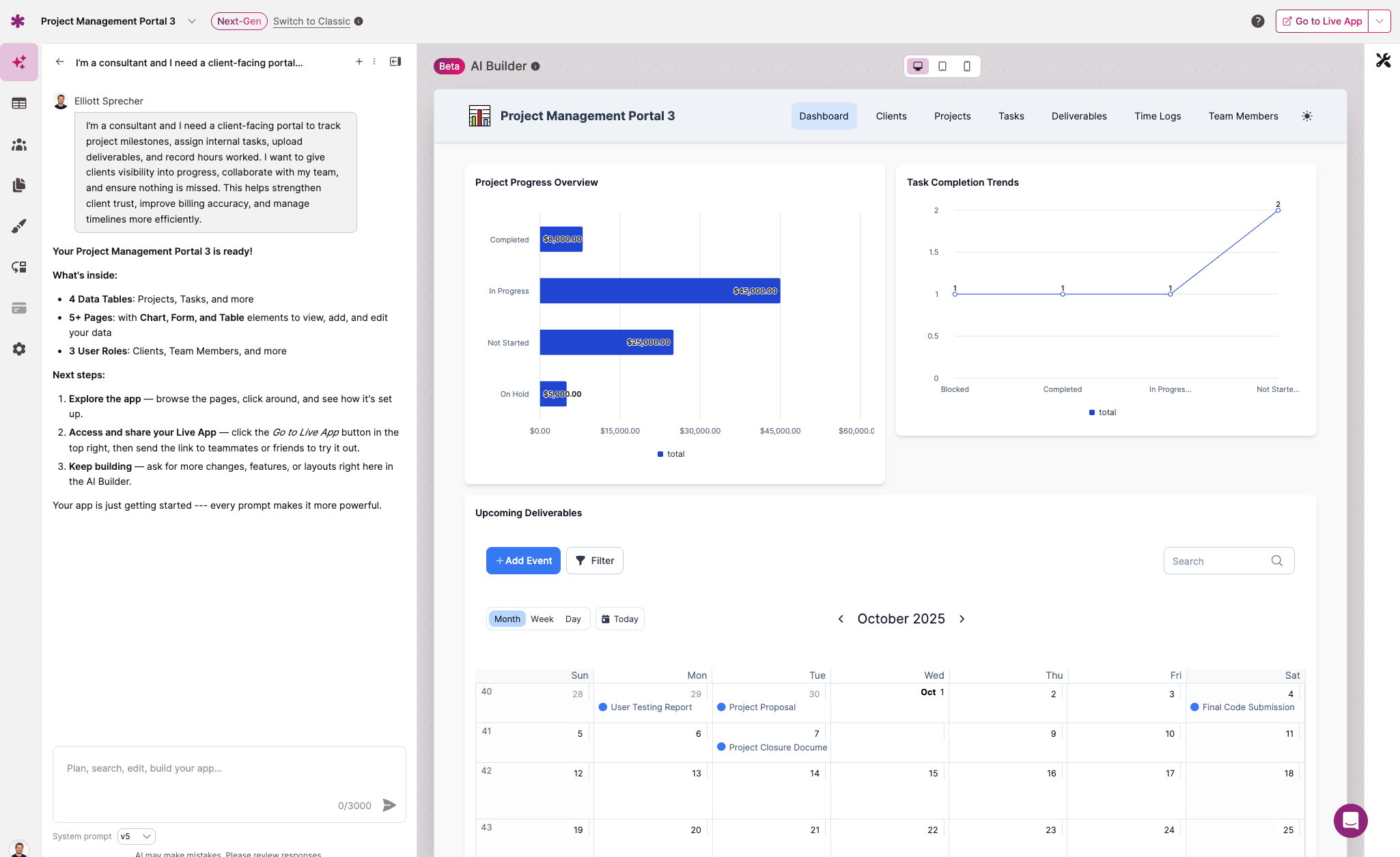 - “Create a dashboard page for Clients showing project status, milestones, and latest deliverables.”