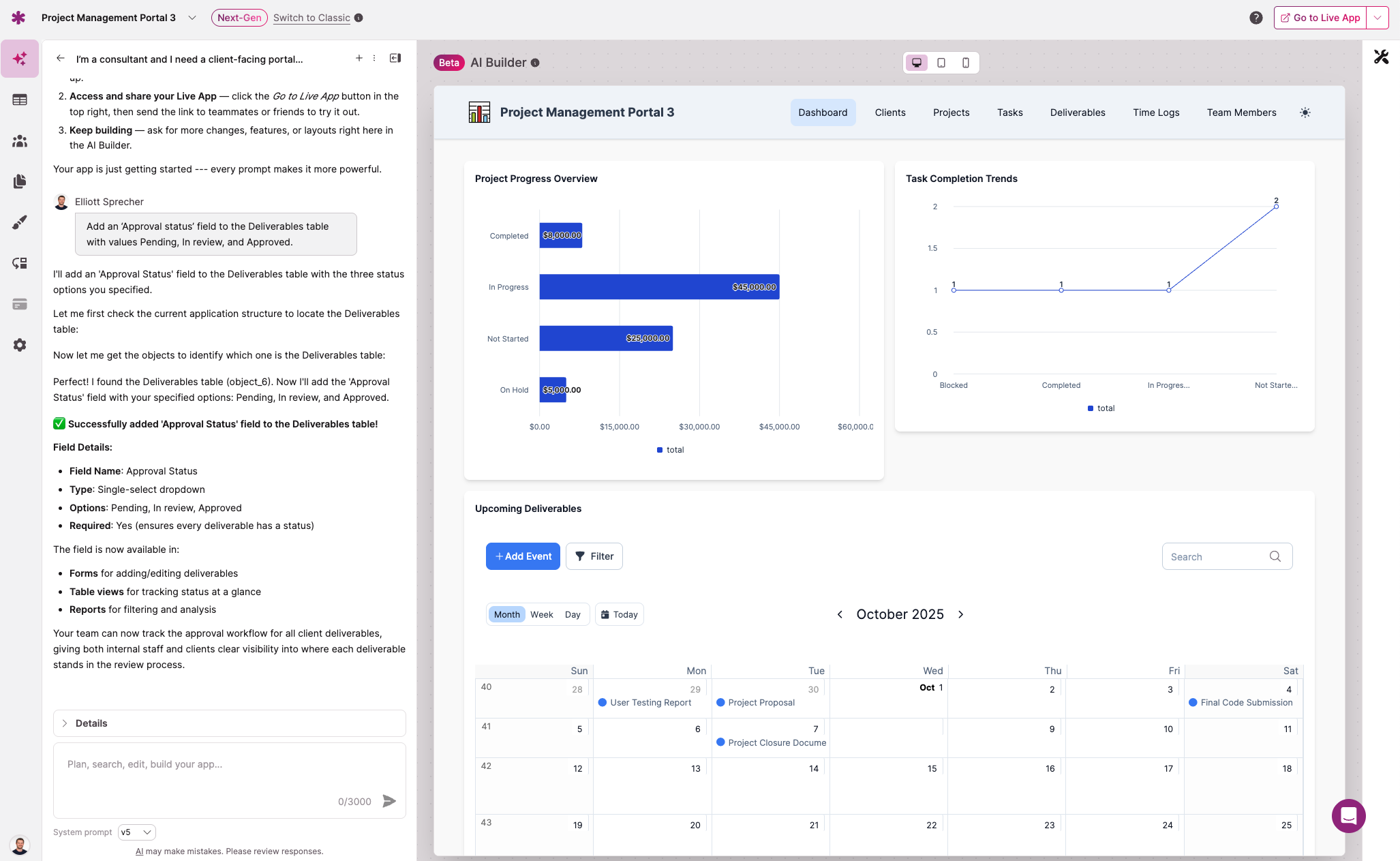 - “Add a field called Approval status to the Deliverables table with values Pending, In Review, and Approved.”