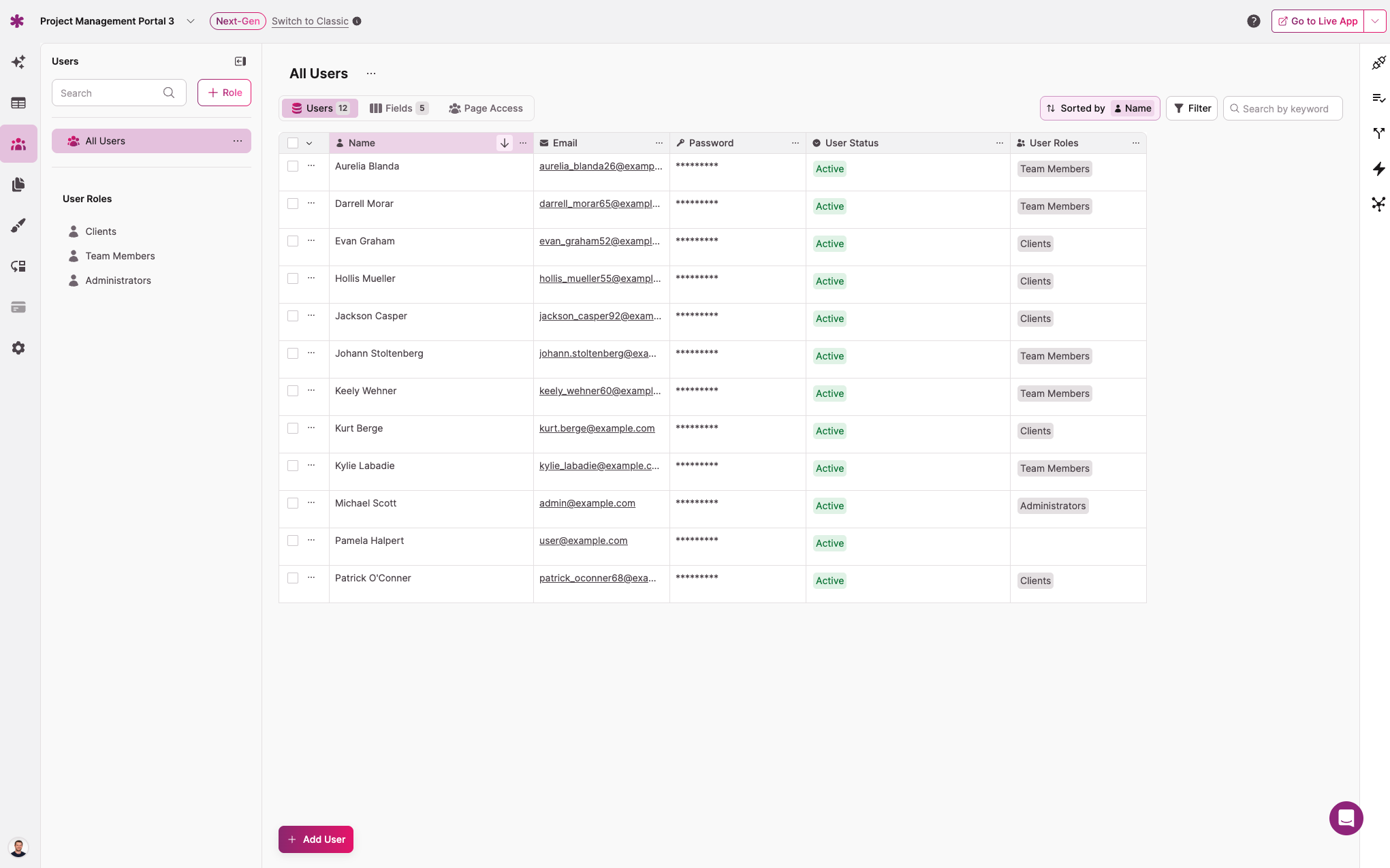 Next, you can add team members or clients and assign roles for Admin, Team, or Client access. Knack’s role management ensures each user sees only what’s relevant. Note that as of this writing, user role and permission management requires manual configuration in the visual builder (it will be supported in the AI builder by the end of 2025).