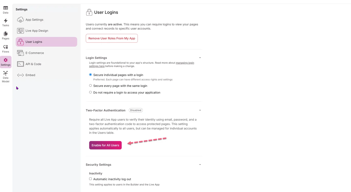 Toggle on 2FA for All Users in Settings