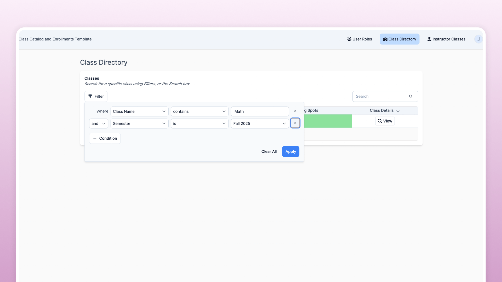 In this class catalog, students can search through the catalog to find classes that interest them. They can then enroll for any classes that are not yet full.