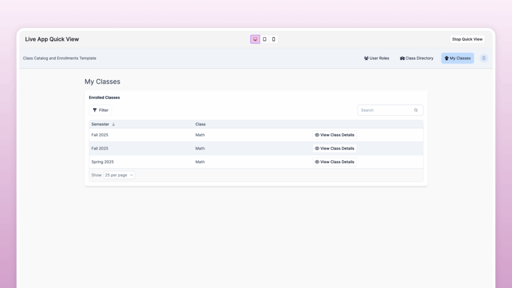 • Save time by building a flexible, no-code Knack app that allows your instructors to easily manage their class offerings without a learning curve.