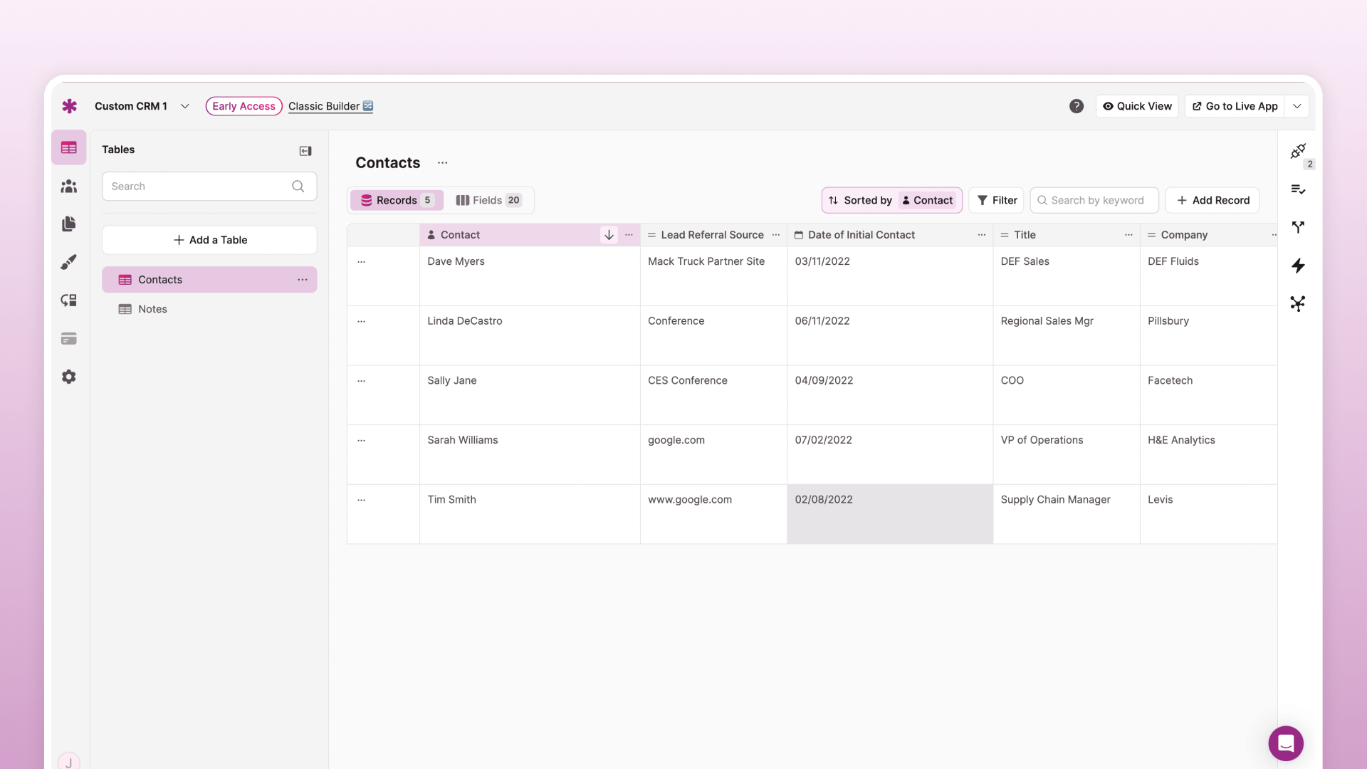 Stop letting pre-built software dictate how you track your customers. Knack lets you build a custom CRM to track and manage your exact customer relationships – no more, no less.