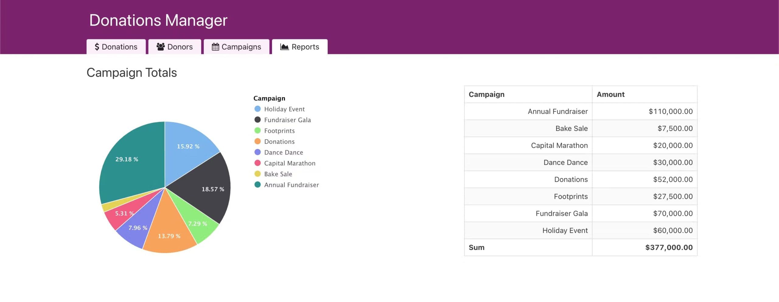 • Donation reports – View percentage of donations by campaign, donations per month, and much more.
