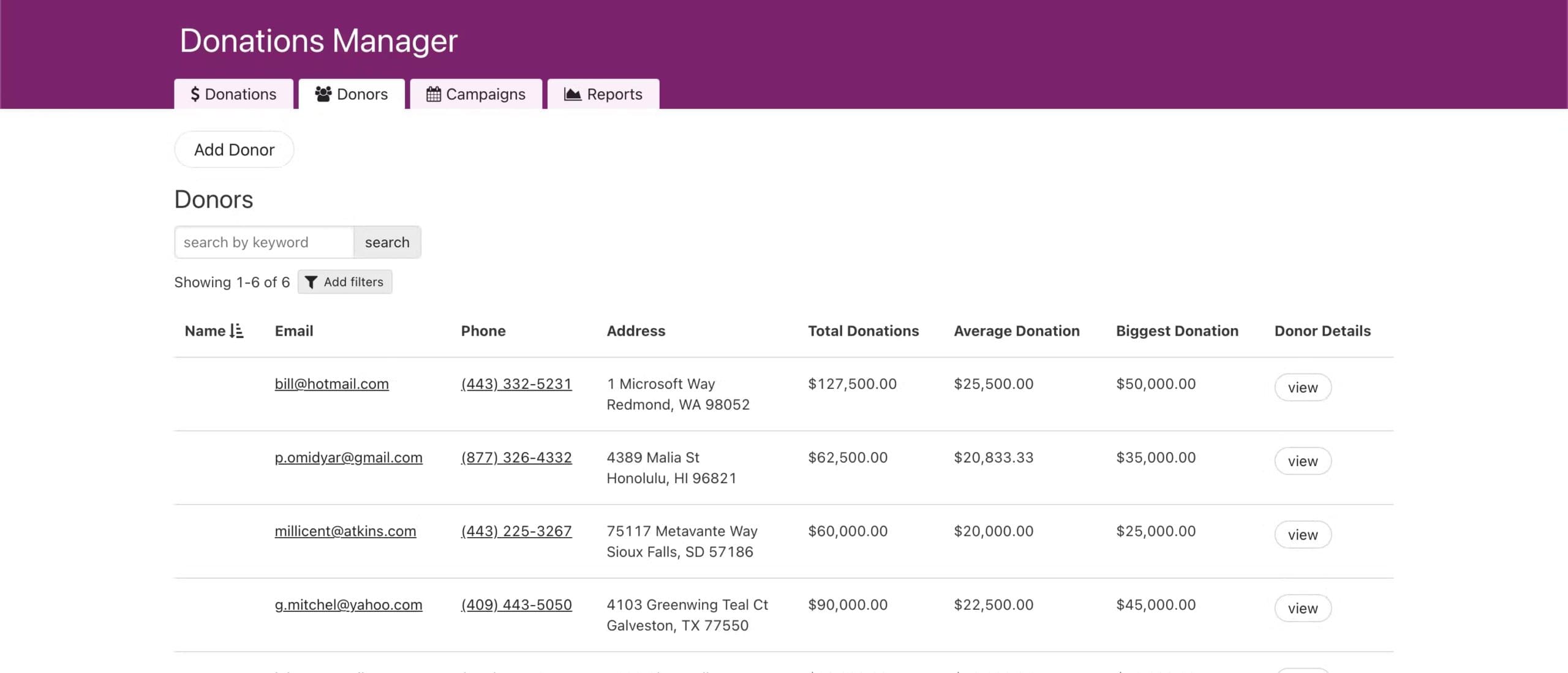 This donations manager app will track donations and run reports on donors and campaigns. There are no bloated features so you can focus in on what’s important: managing your donations and getting key insights on donors and campaigns.