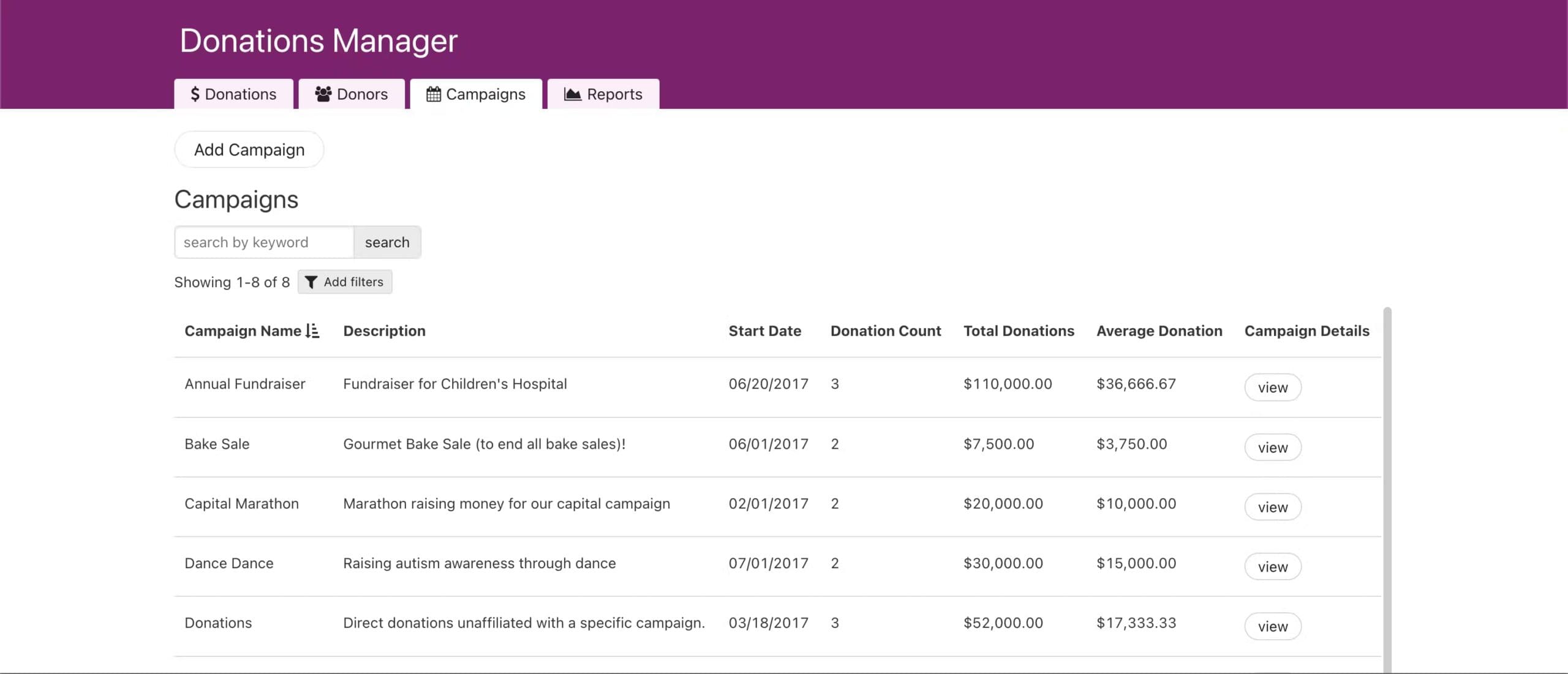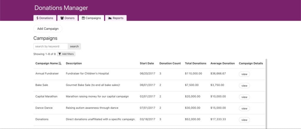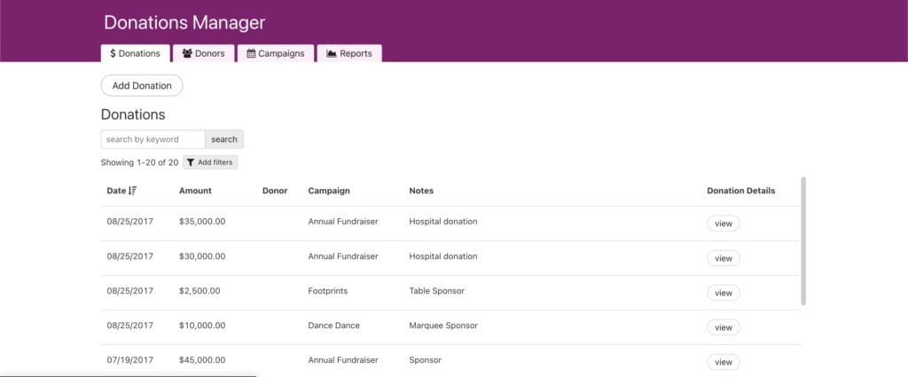 Donation management makes it easy to track your donations, donors, and campaigns.