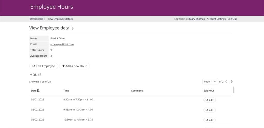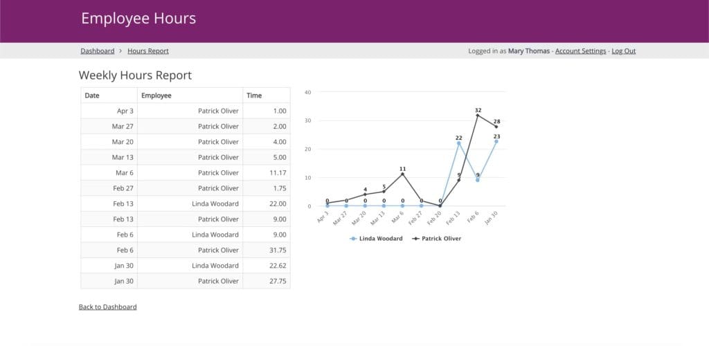 • Employee logins: Each employee logs in to update their own hours and can access their info only.