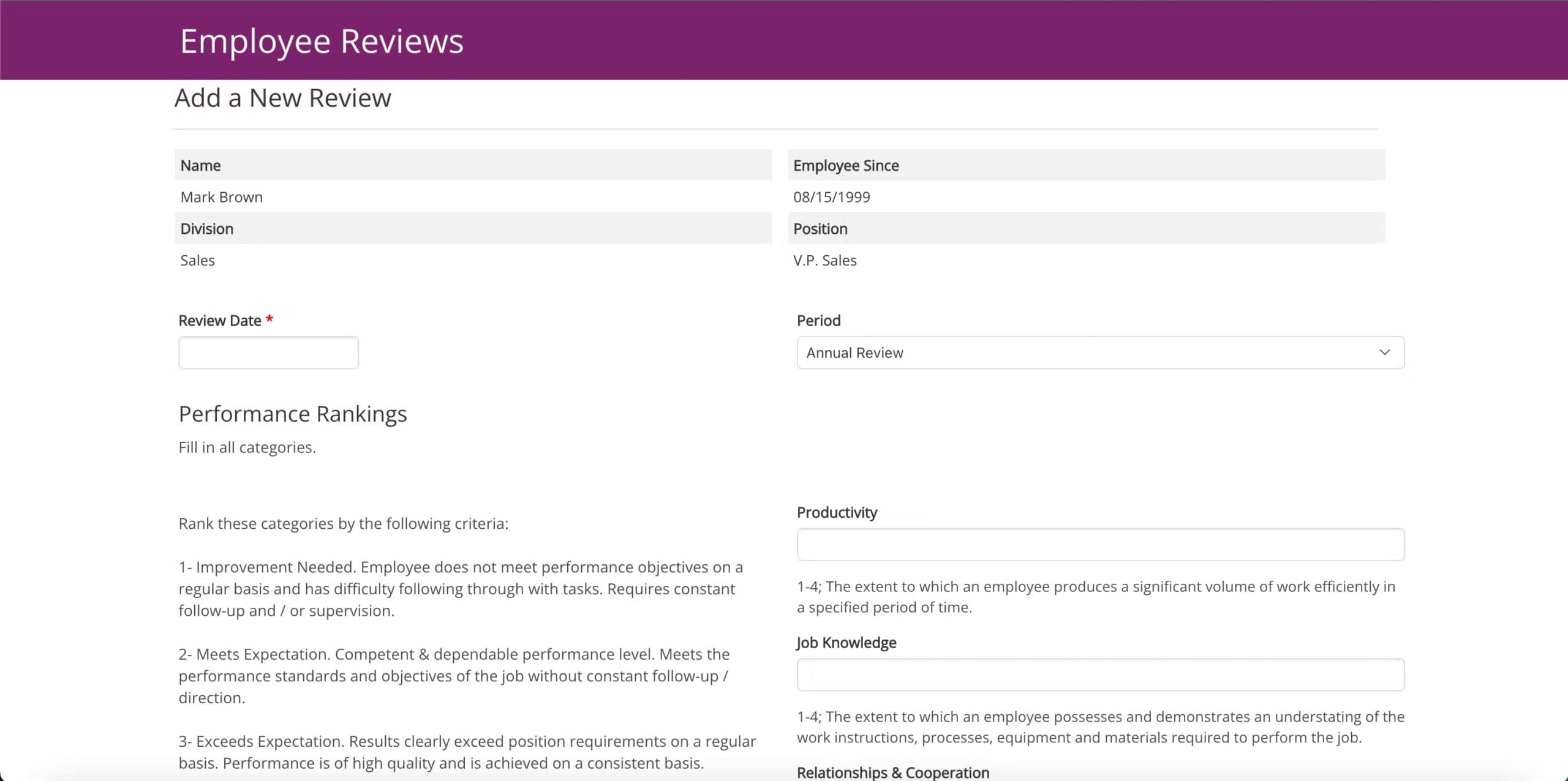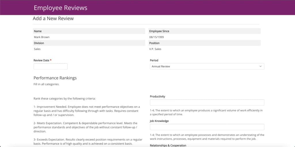 This employee review demo includes a password-protected area that allows HR staff and managers to add performance details and summaries from quarterly or yearly employee reviews.