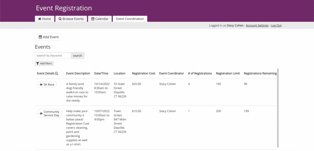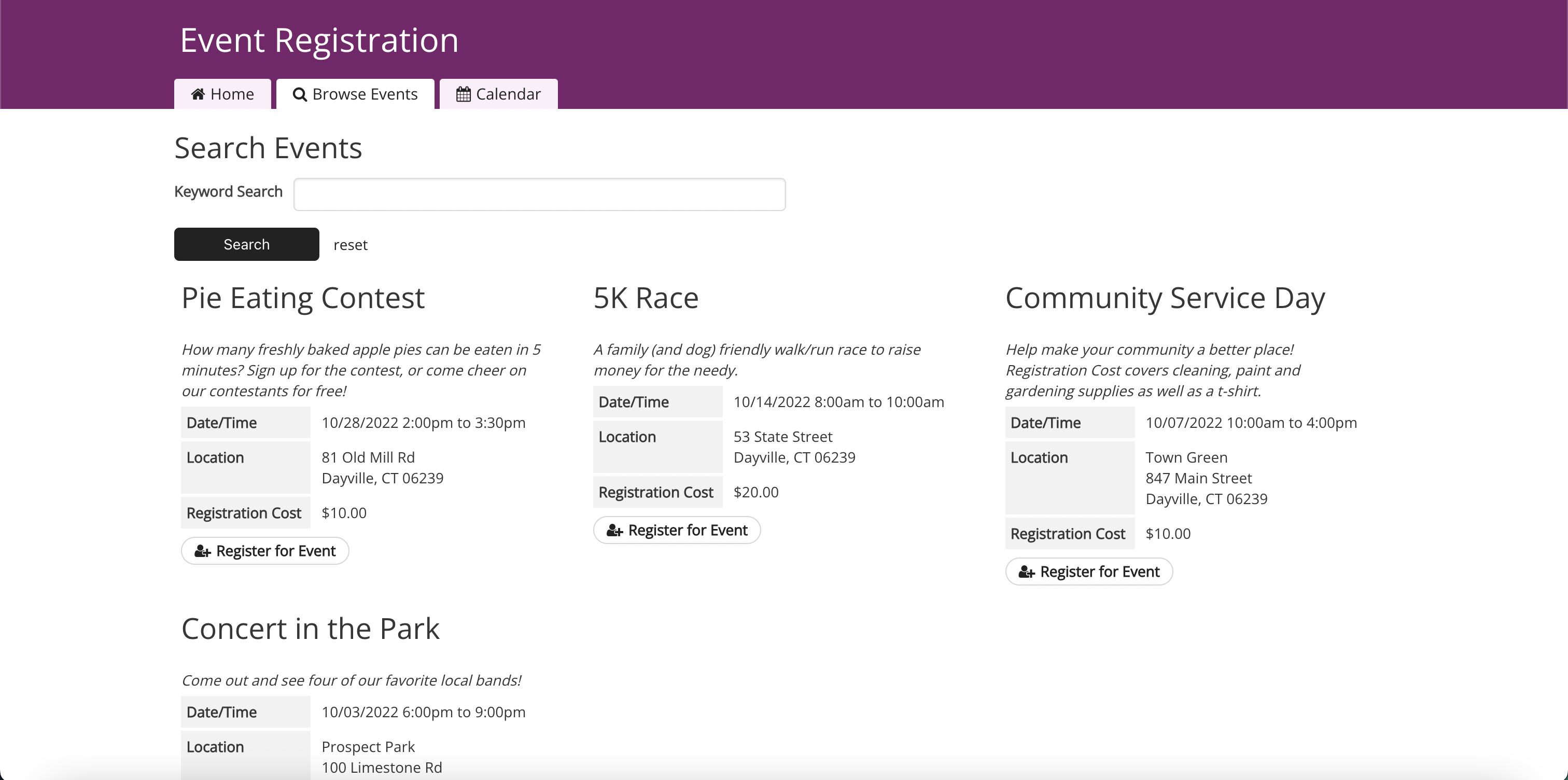 Users can search through your event listings, register, and pay for events. Event coordinators add, edit, and remove events, specifying the capacity for each.