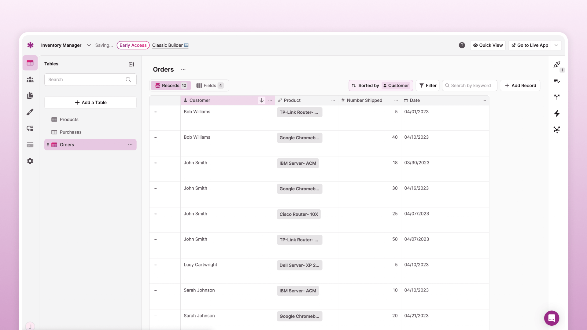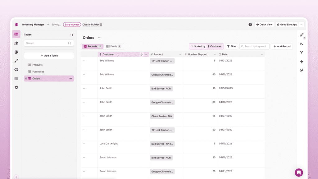 With Knack, you can say goodbye to bloated enterprise software and build a custom solution that enables you to make smart inventory decisions because you have timely and accurate inventory data.