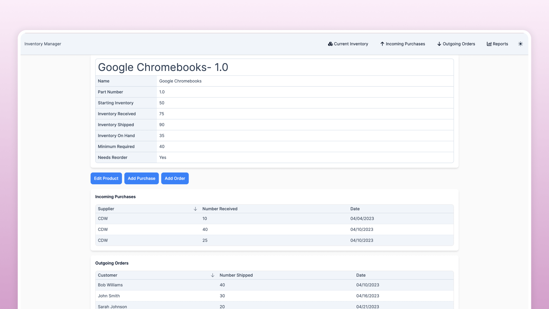 Screenshots of the Inventory Management Template