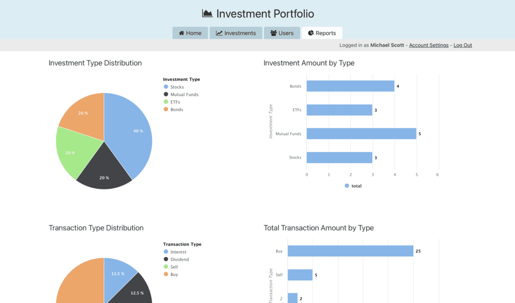 • Reports Generation: Supports generating and exporting customizable reports on portfolio performance and transactions in various formats. This feature allows for in-depth review and analysis of both stock portfolio performance and individual transaction details, essential for strategic planning and reporting.