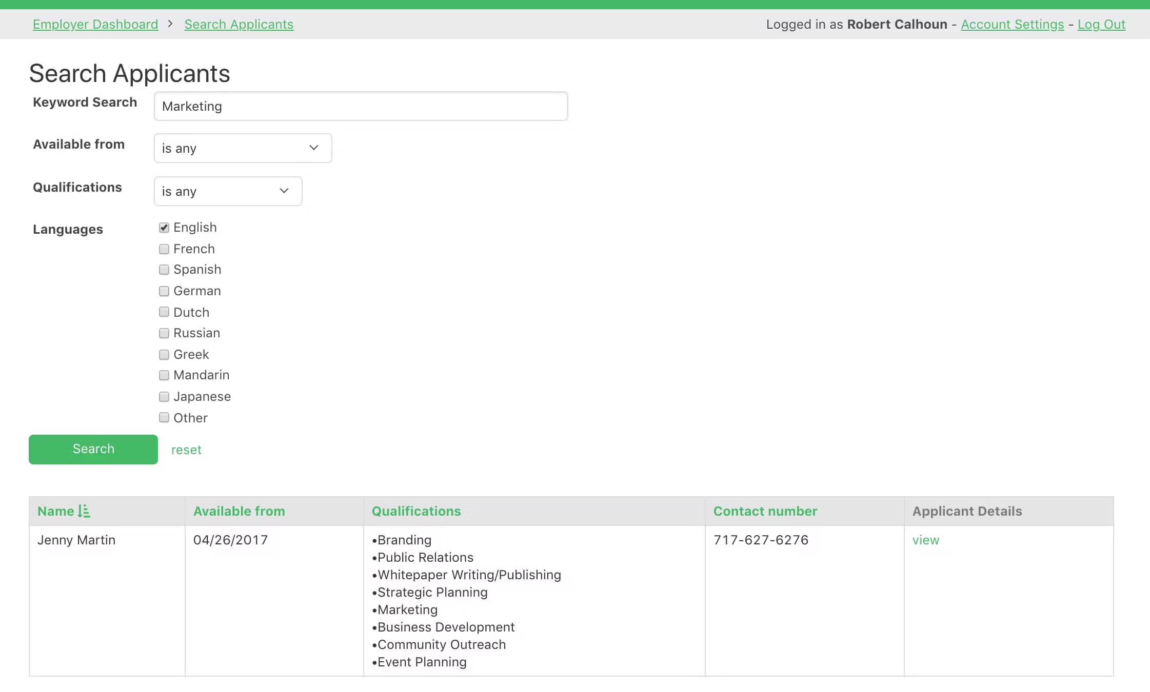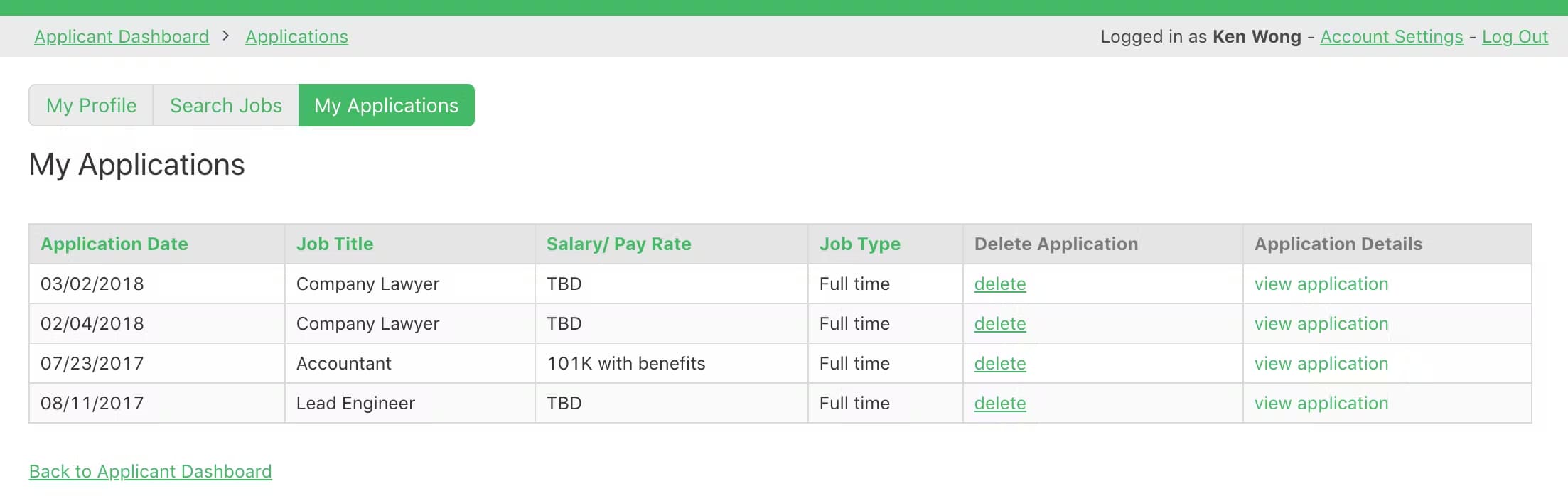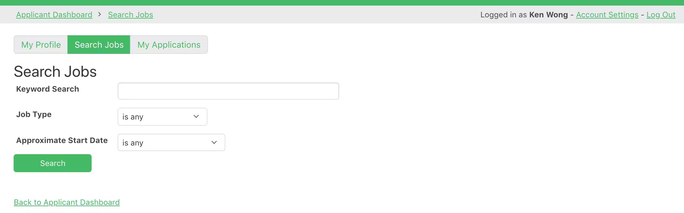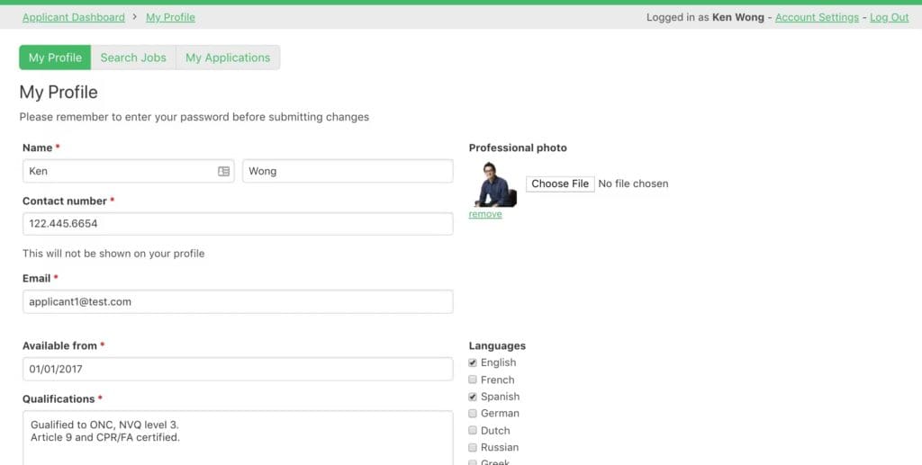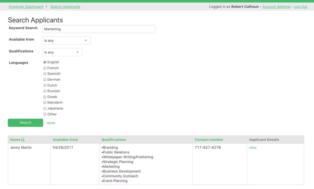 Applicants login and apply for available jobs. They also manage their own profile, which gets sent to the employer with each application.