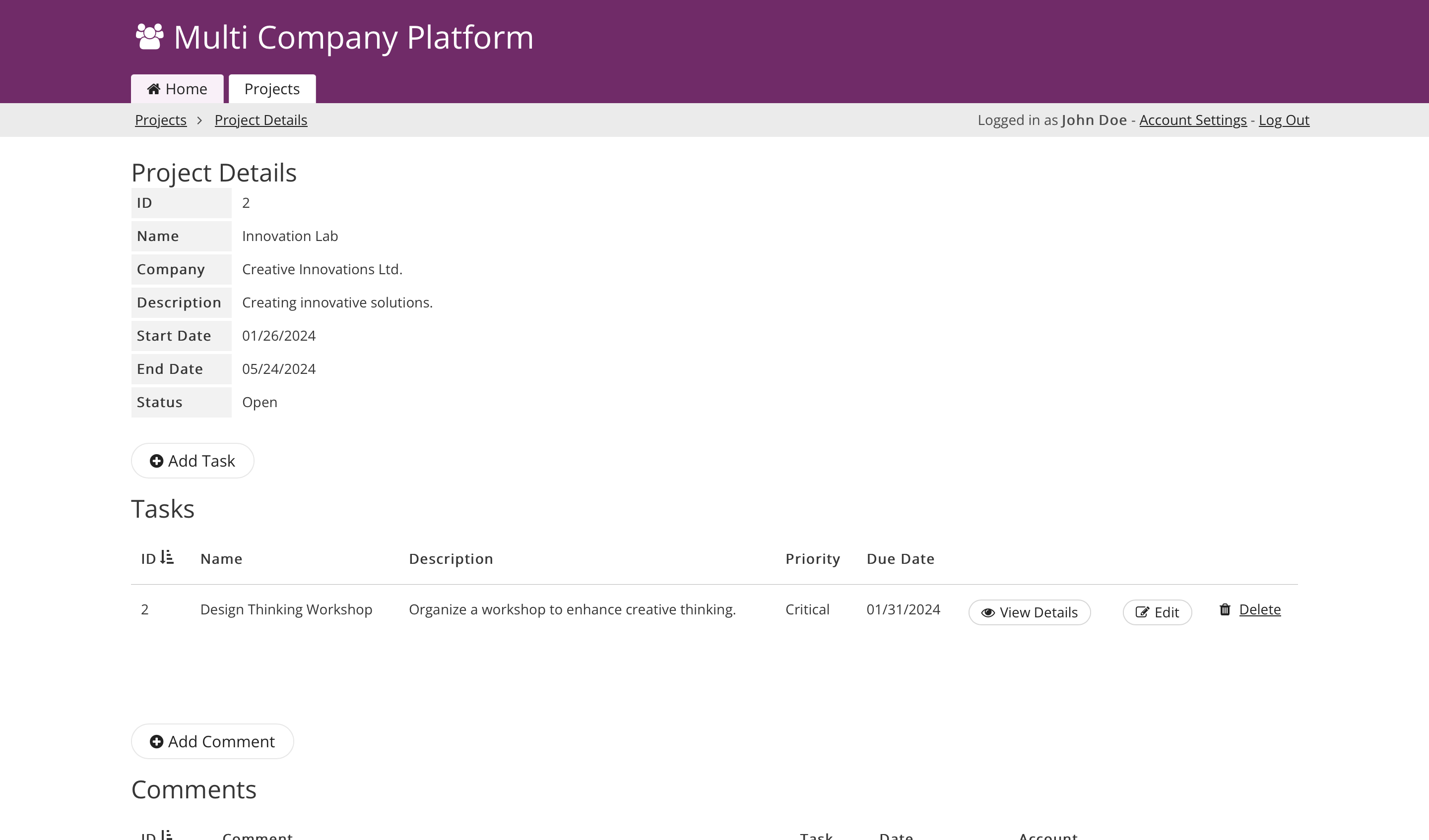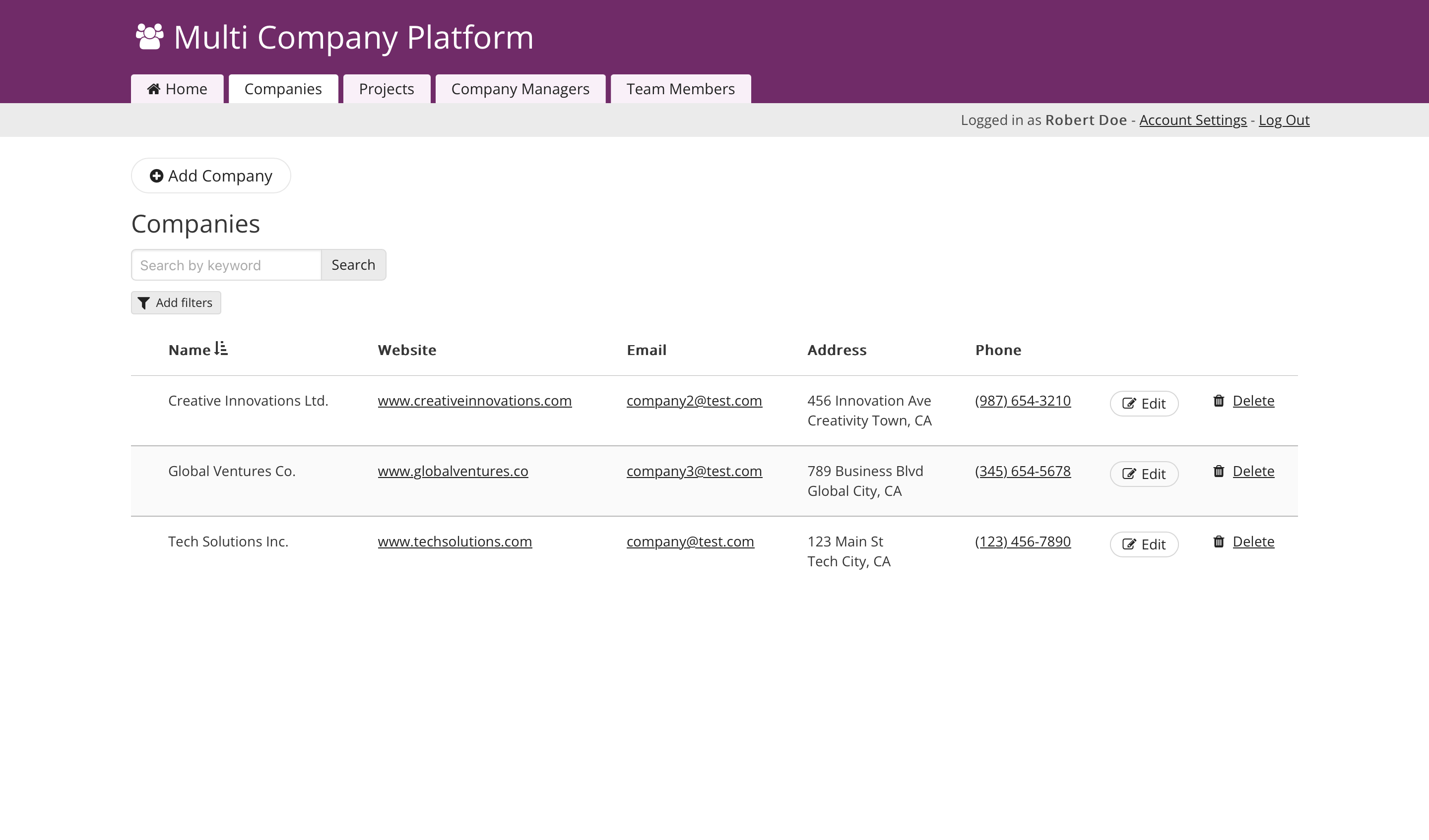 The Multi-Company Platform app template, a cutting-edge management software, is designed to simplify the process of managing different companies, providing a streamlined, secure, and efficient way to oversee various business operations and tasks from a single, unified interface. This robust platform is tailor-made for enterprises that operate numerous entities or manage a portfolio of client projects, offering a comprehensive solution to enhance operational efficiency and improve project outcomes across different companies.