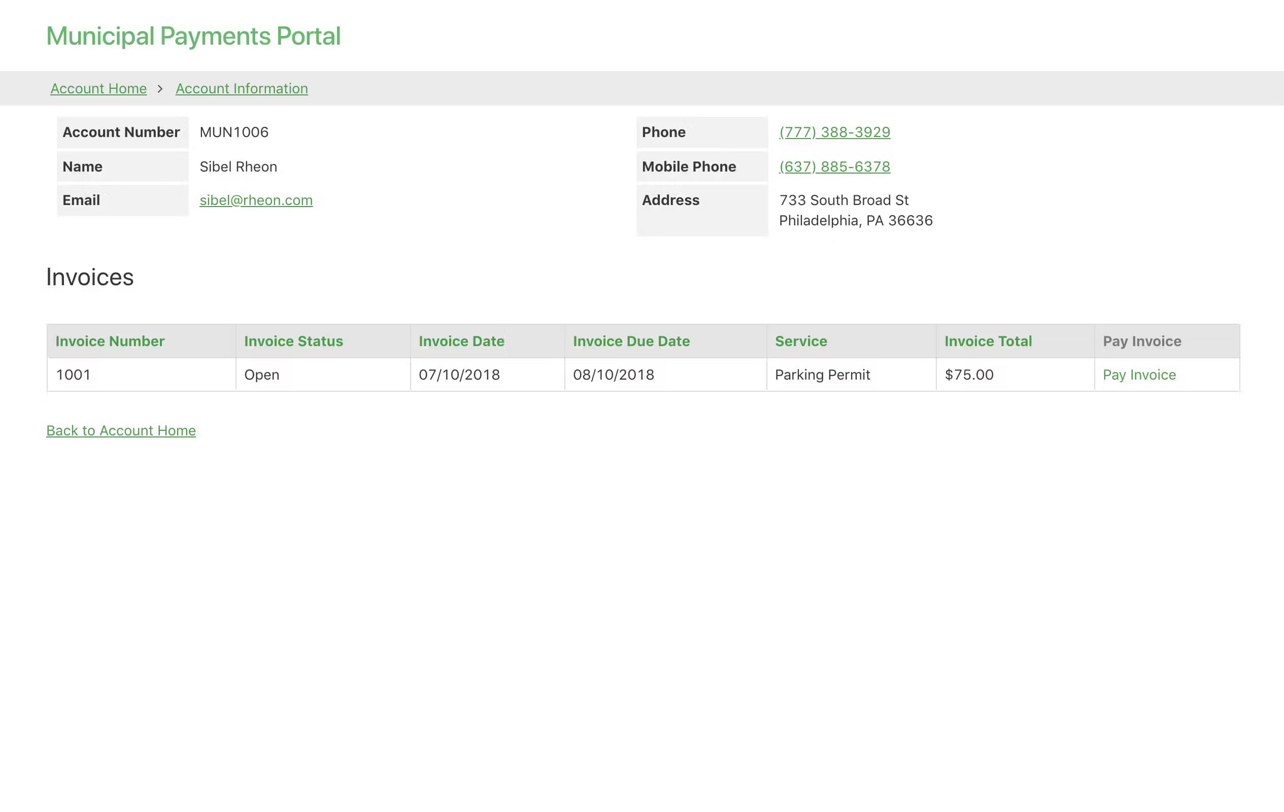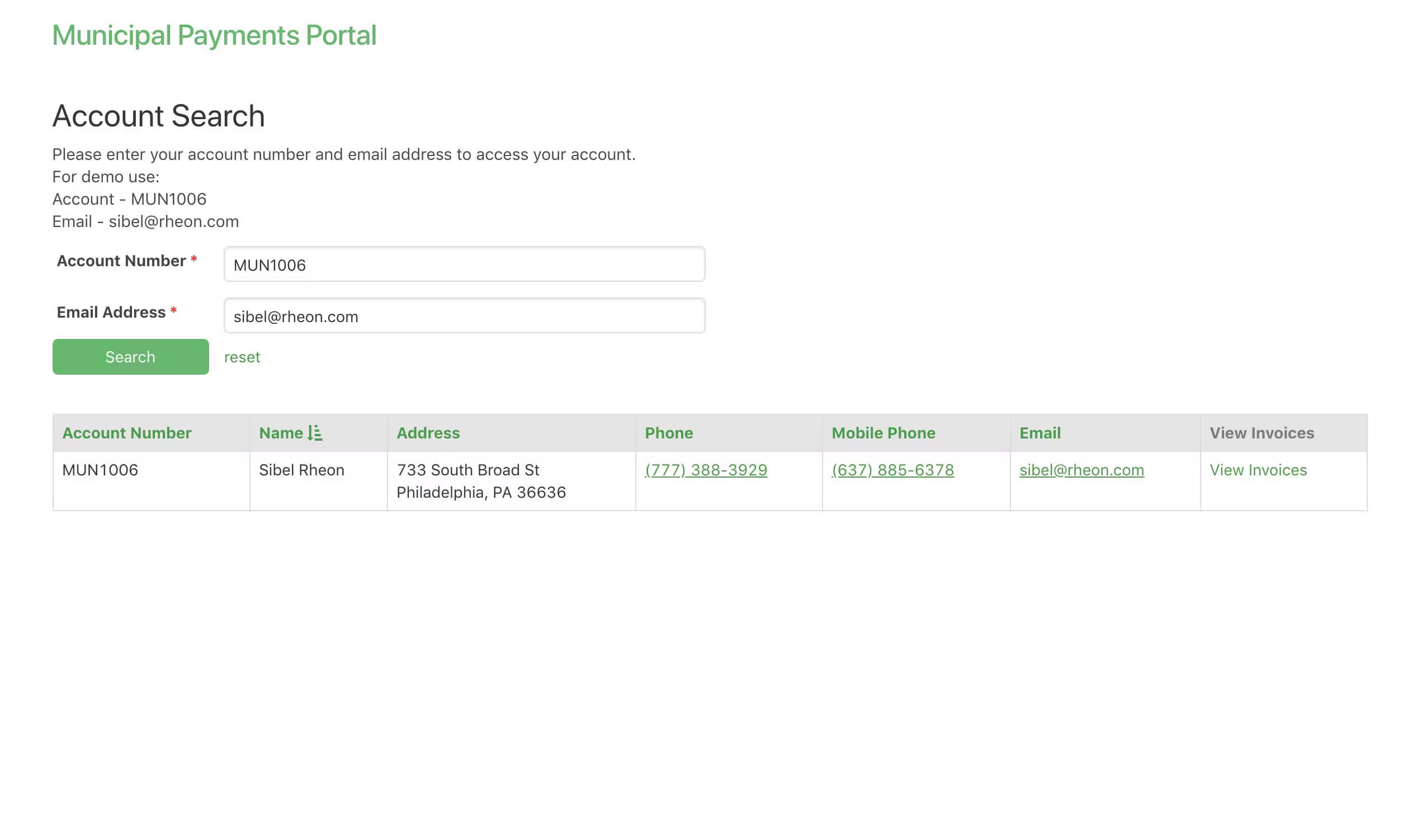 • Security & Simplicity – Residents search for their invoices using their assigned account number. Using the unique value and exact match features, they will have access only to their account ensuring their security without requiring them to log in.
