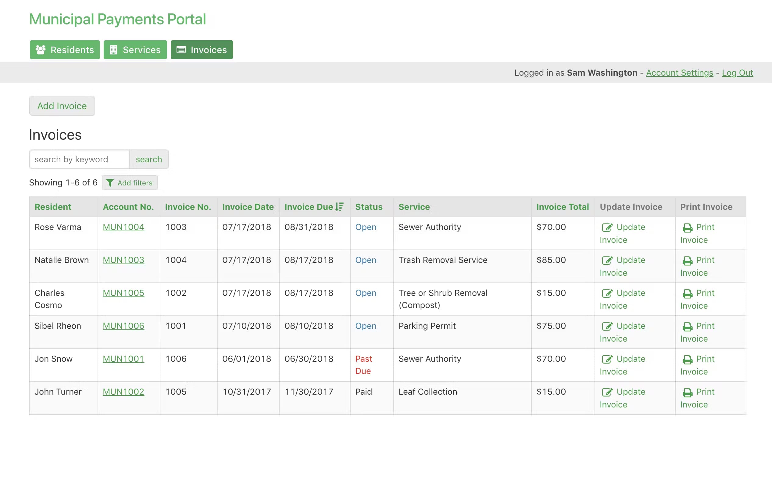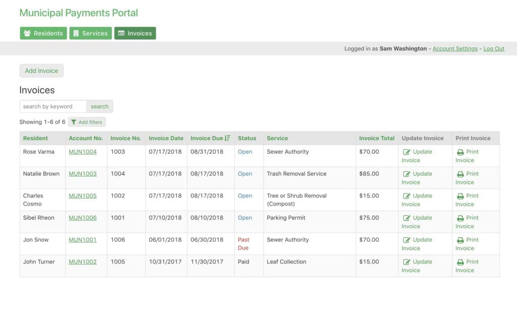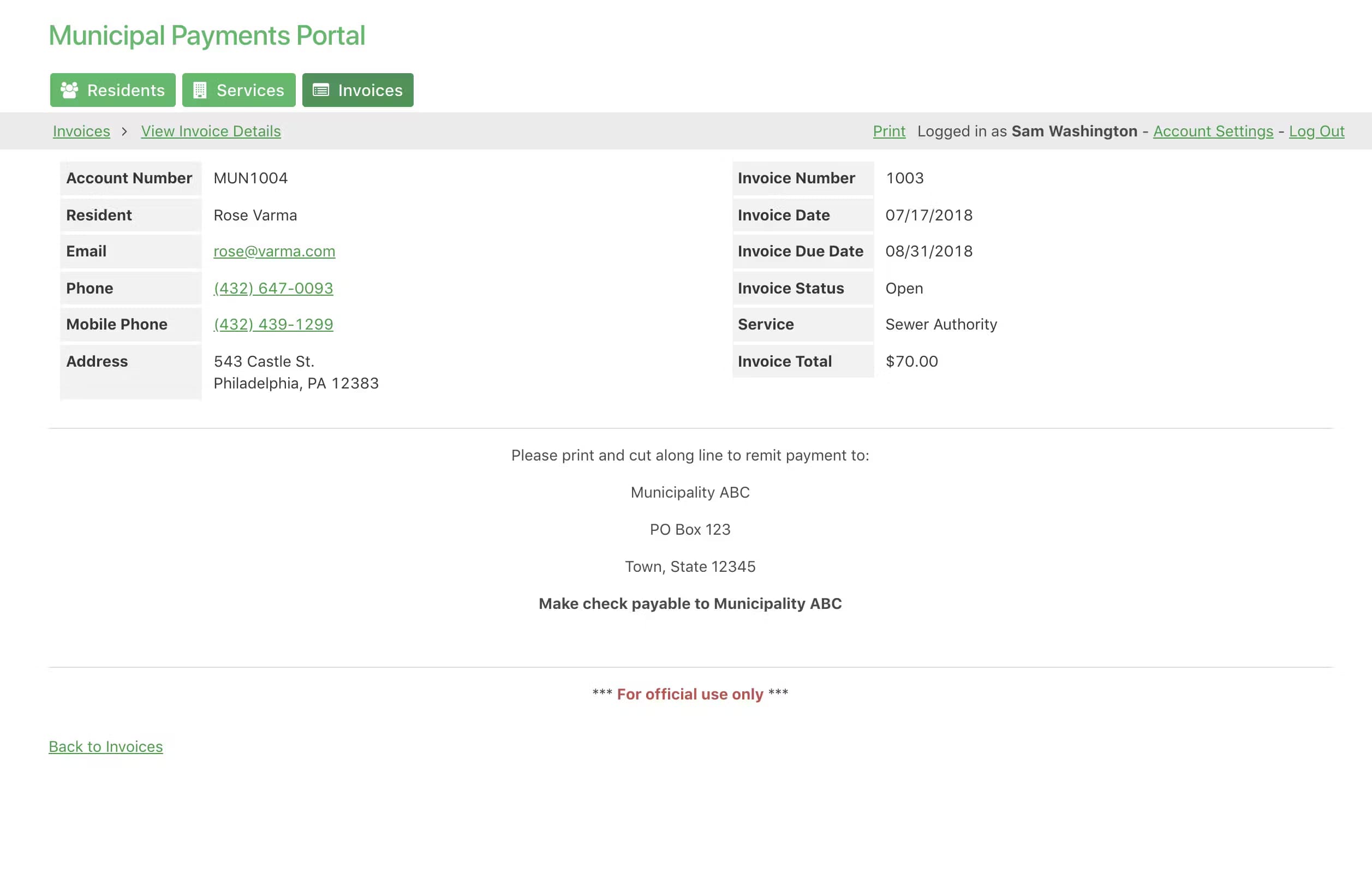 • Easily generate invoices for residents who are required to pay for various municipal services, such as trash collection, water, sewer, or parking permits.