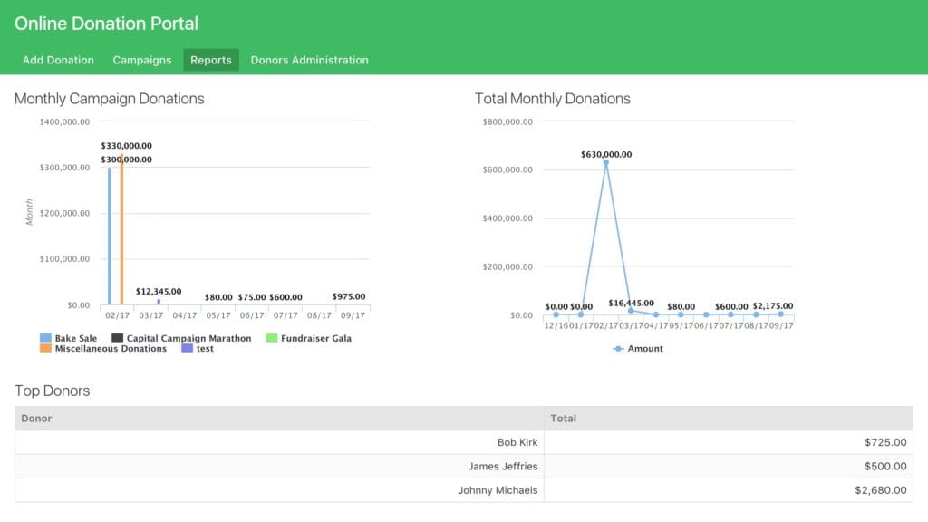 • Donation reports – View percentage of donations by campaign, donations per month, and much more.