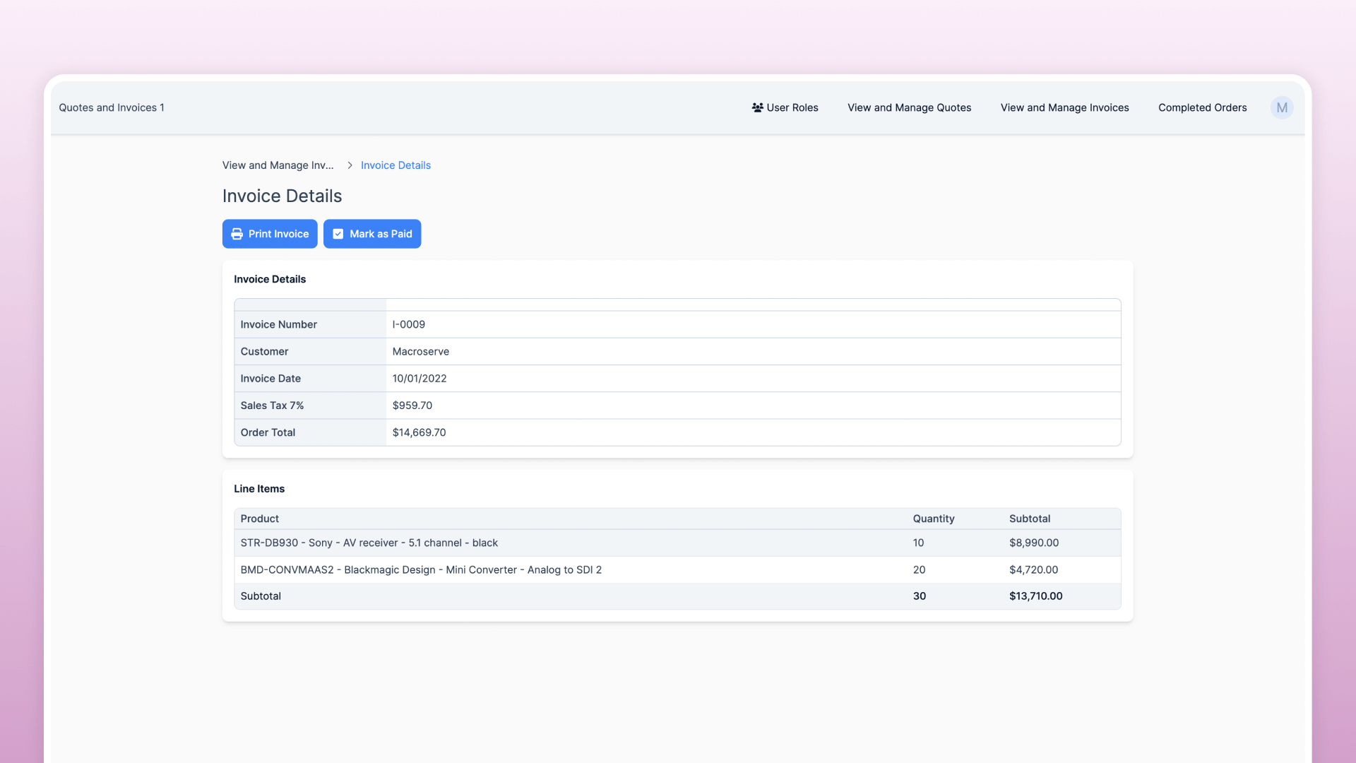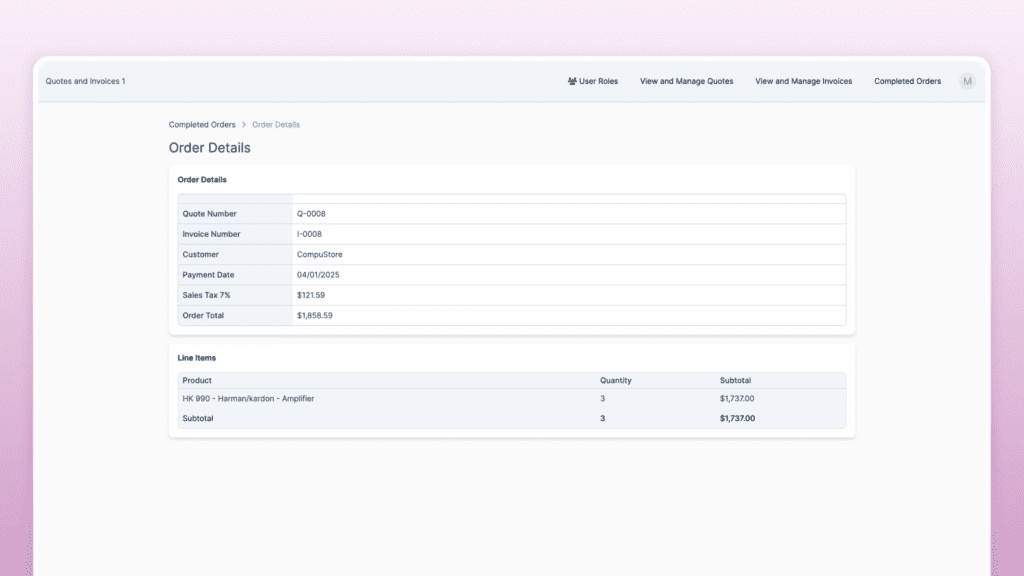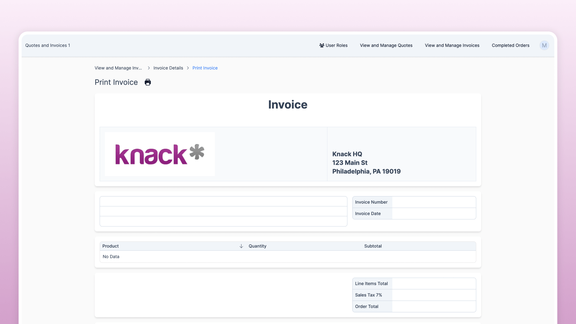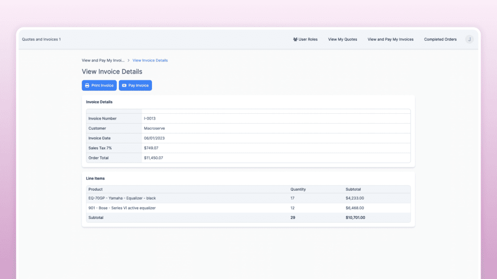 Both sales and your customers can generate print-friendly versions of their quotes and invoices.