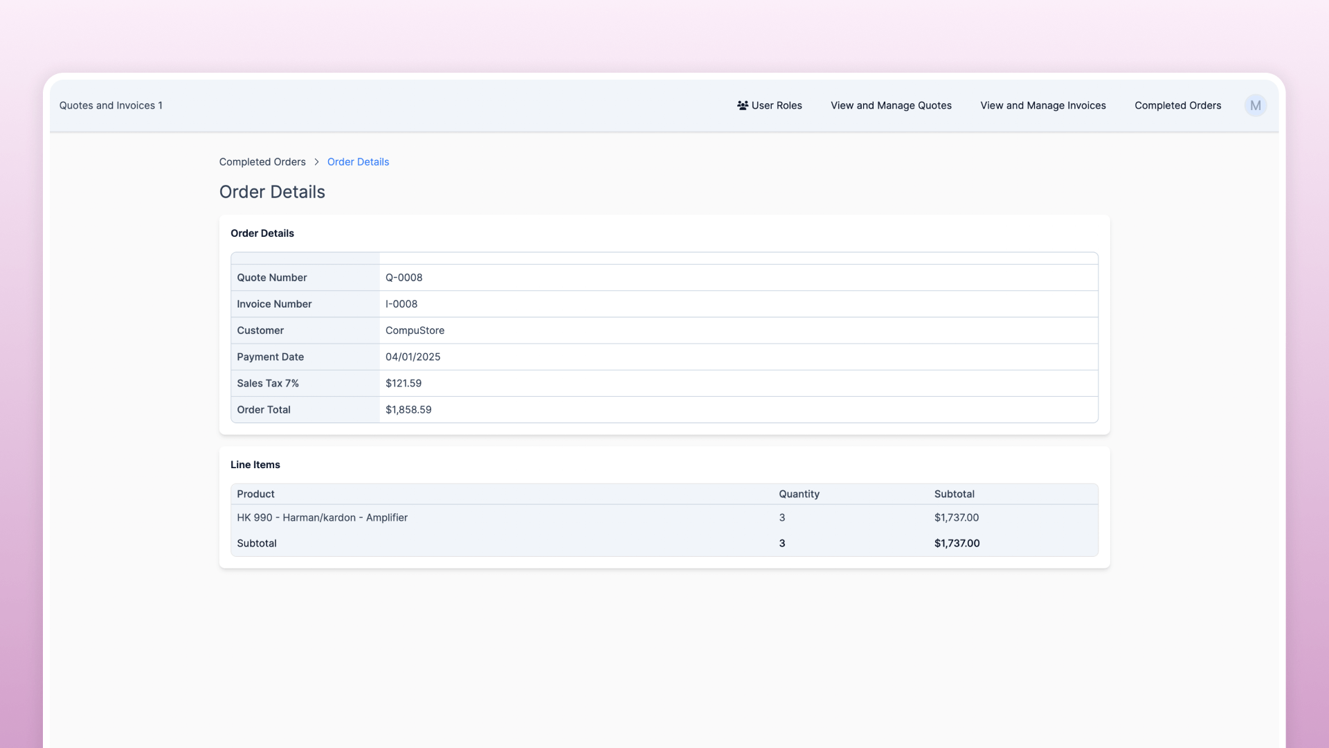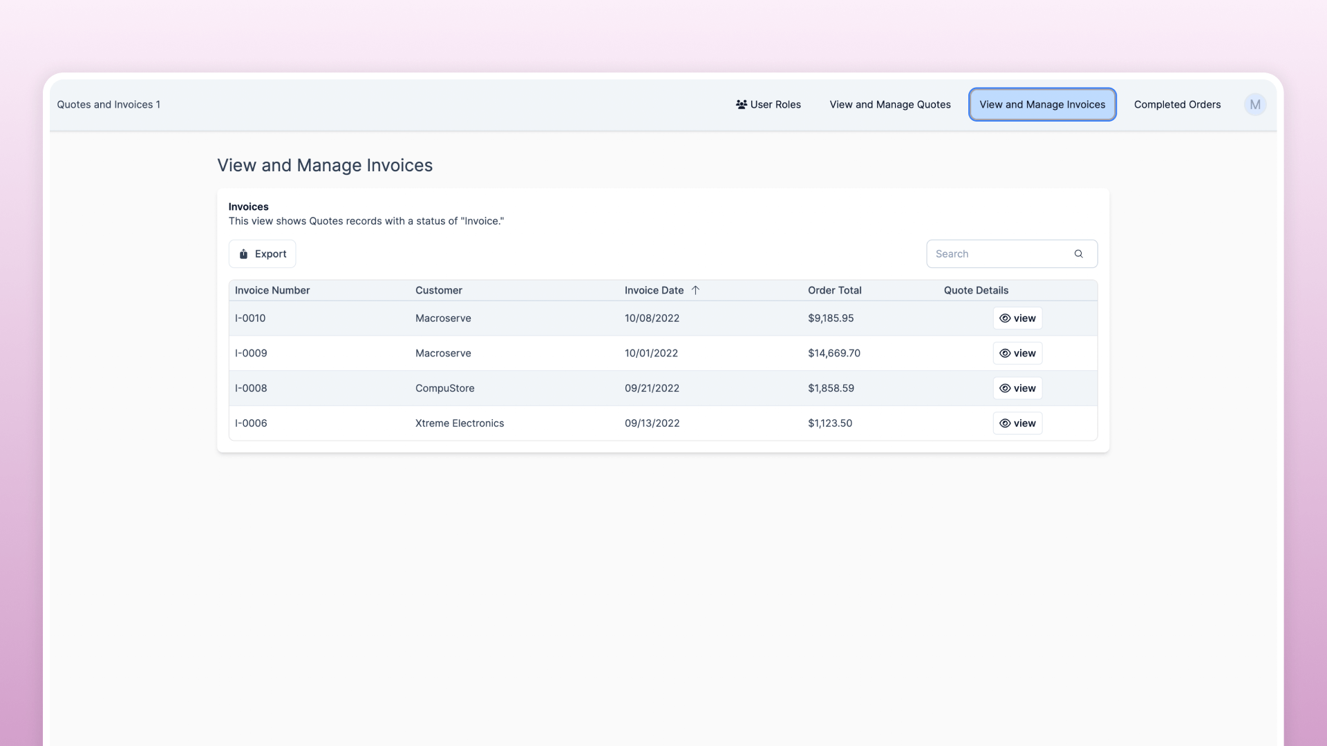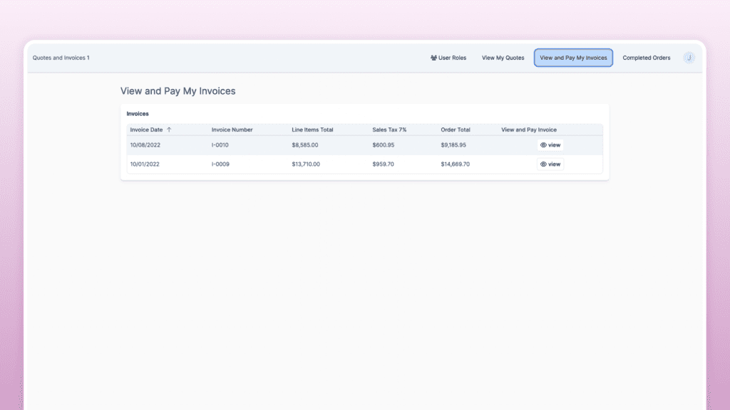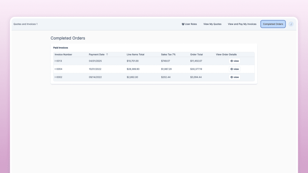Customers can log in to view and approve their quotes, pay invoices, and see their order history.