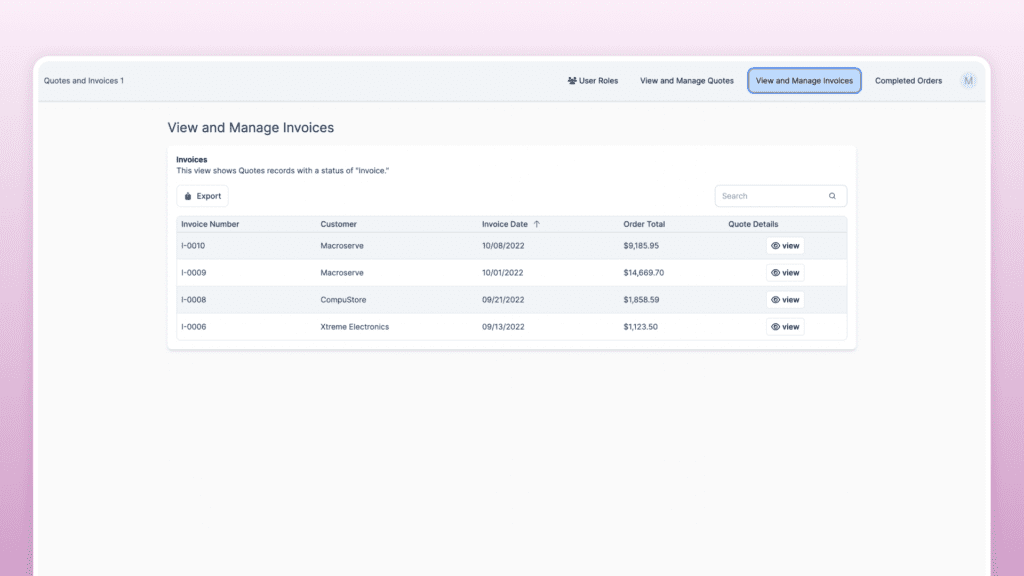 This quoting app gives sales reps a portal to generate quotes, convert quotes to invoices at the click of a button, and record received payments.
