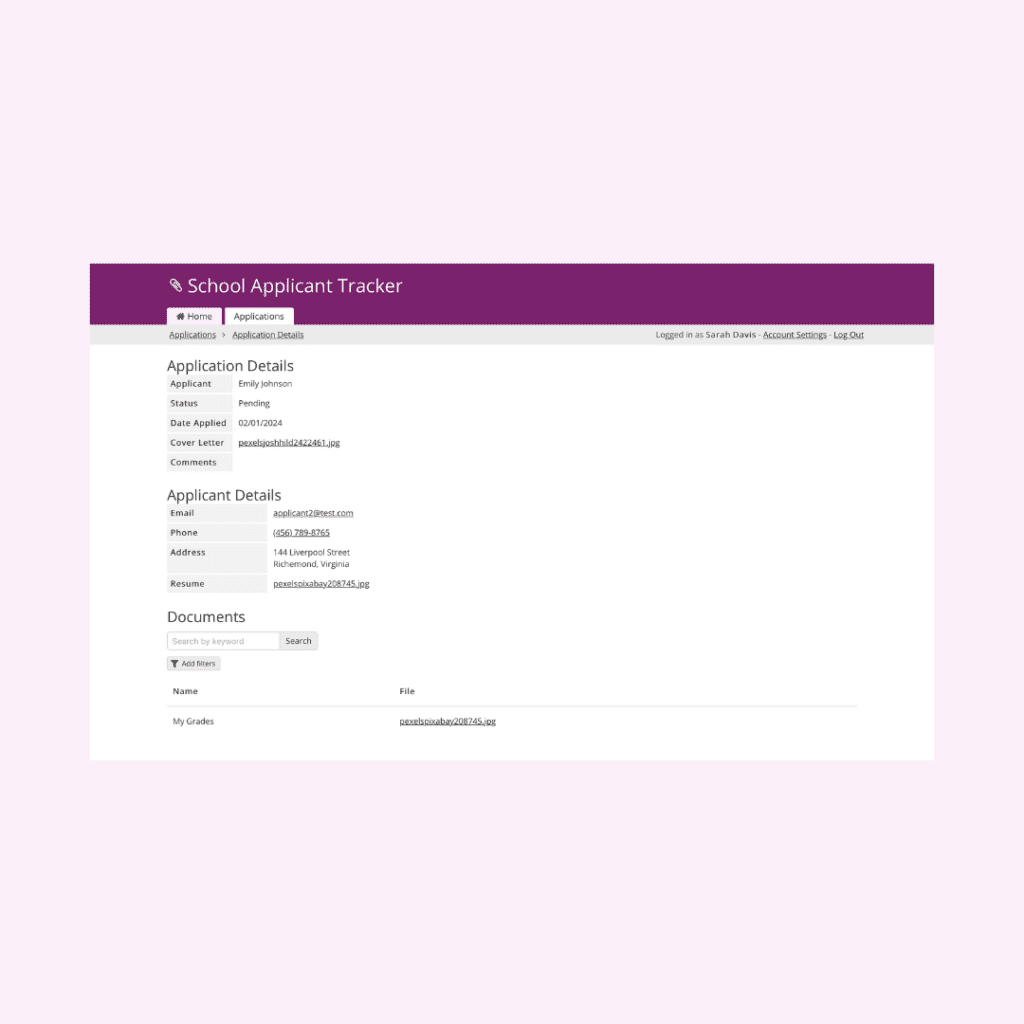 - Document Storage: Store and manage documents for each applicant. Include fields such as DocumentID, ApplicationID, Name, and Link to ensure easy access and organization of important documents.