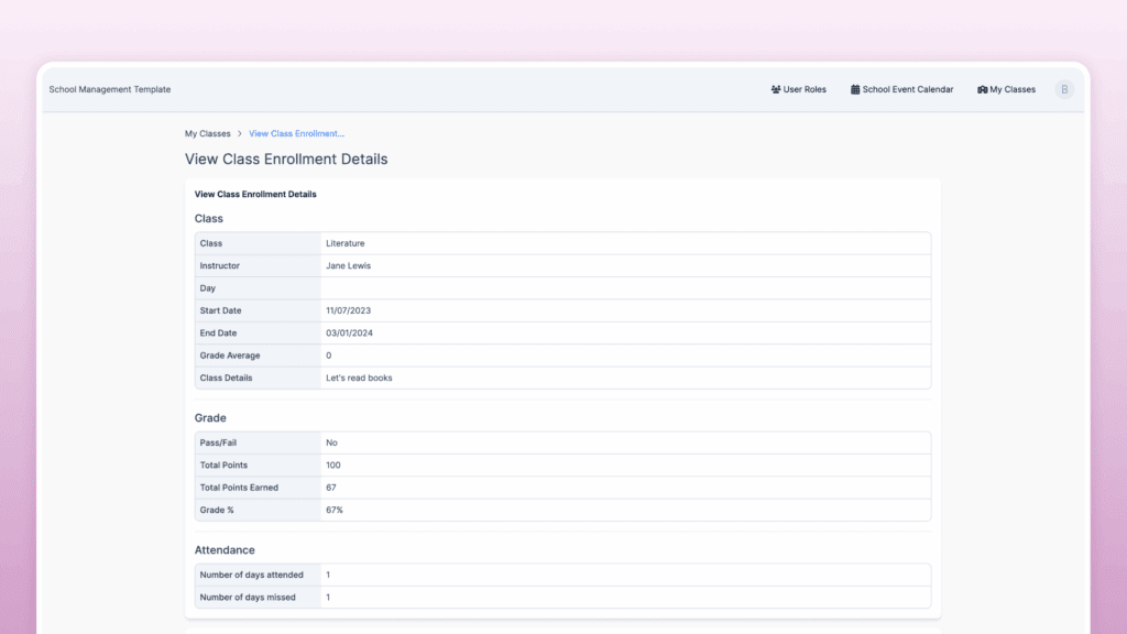 • Comprehensive School Management: Knack’s school management software template app offers an all-in-one solution, allowing schools to efficiently handle student data, attendance tracking, report cards, and more in a single platform.