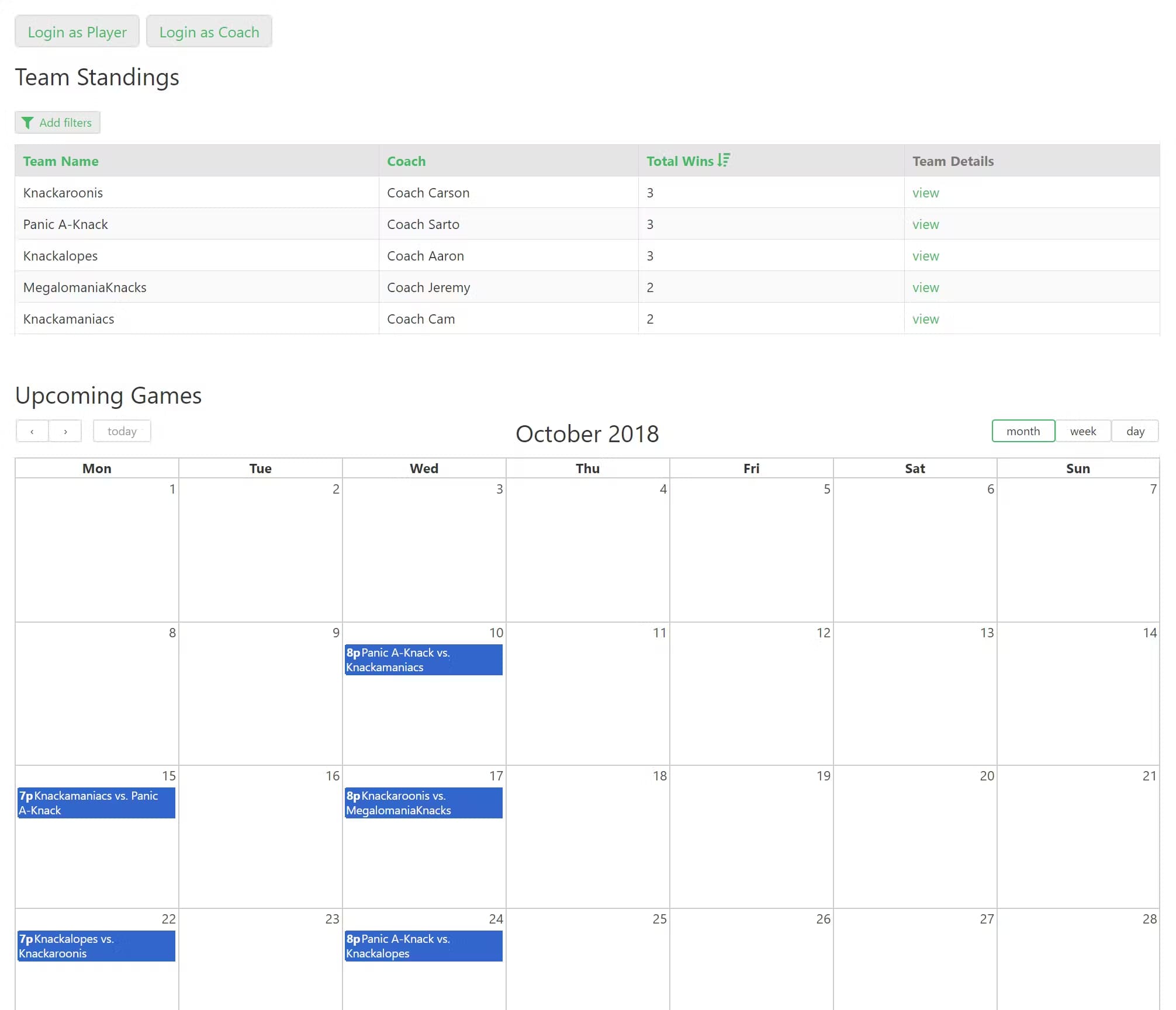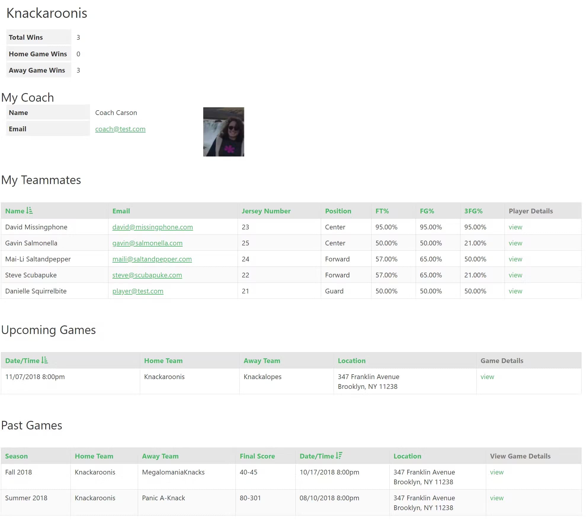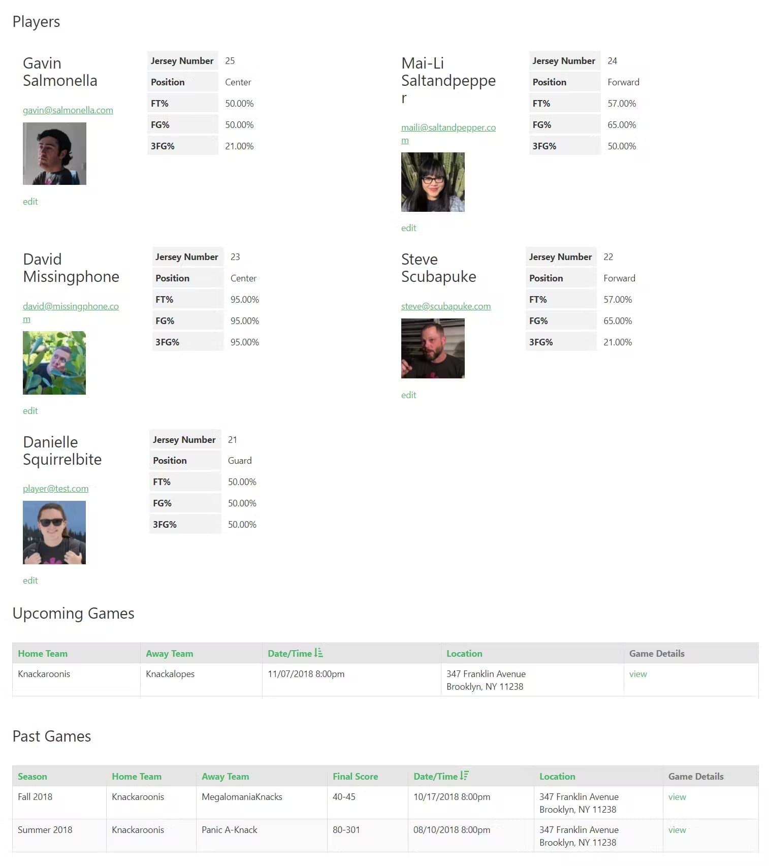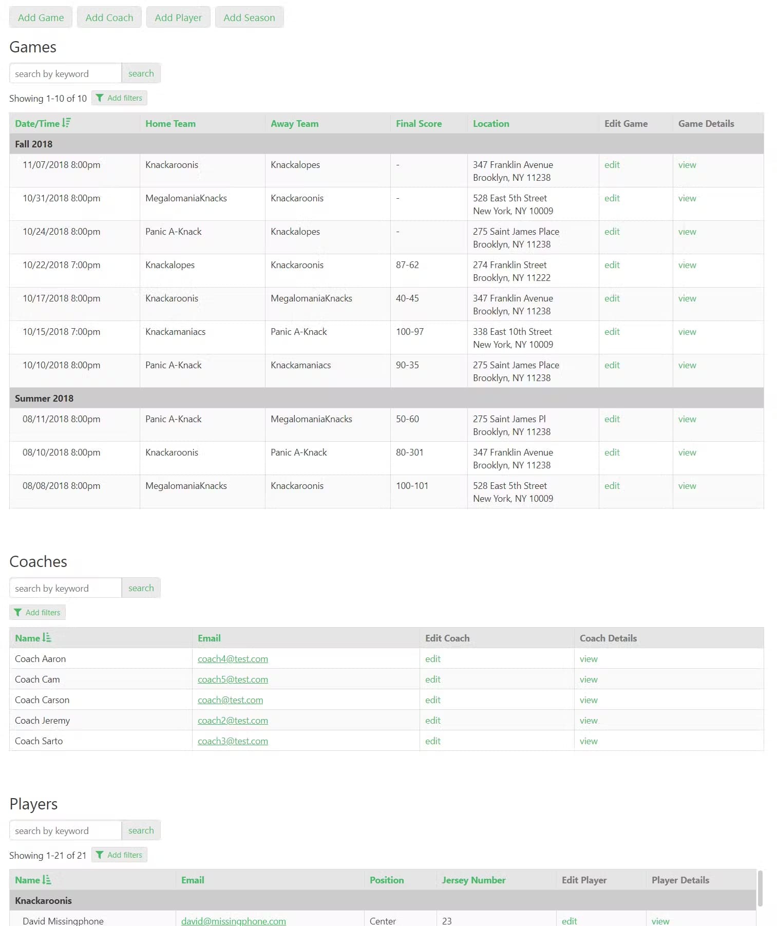 This sports league app gives admins a portal to manage the season. They schedule new games, track scores, and add teams to each game. They also manage the teams – both players and coaches.