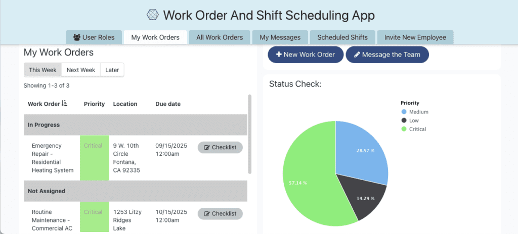 Provides built-in communication tools for managing messages related to work orders, such as shift swap requests or customer updates. Urgent messages are flagged for quick identification, ensuring timely communication.